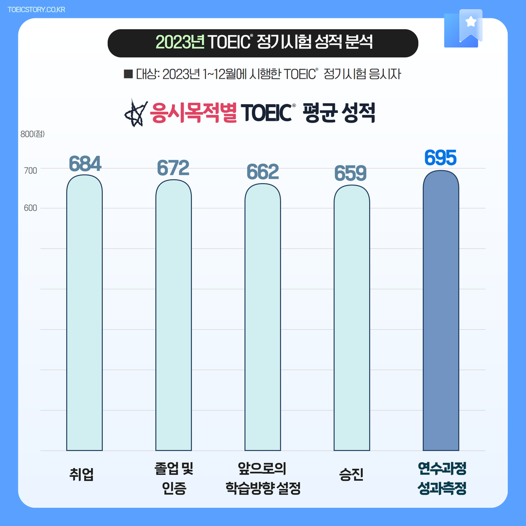 응시목적별 토익 평균 성적도 확인해 보겠습니다. '연수과정 성과측정'을 목표로 응시한 수험자들의 평균 성적이 695점으로 가장 높았습니다. 응시목적별 1위였던 '취업'은 684점으로 2위를 차지했네요!