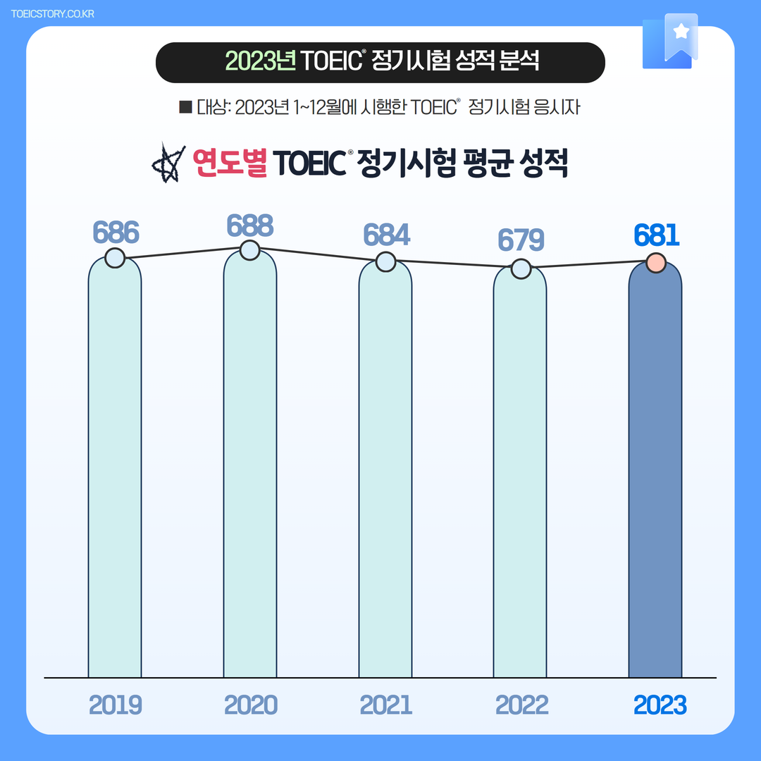 2023년 토익 평균 성적은 전년(2022년) 평균 성적인 679점 대비, 681점으로 2점 상승했습니다. 짝짝짝!