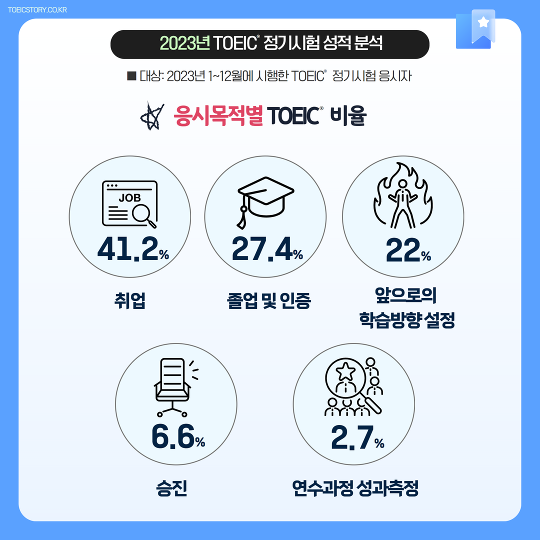 2023년 토익 정기시험 수험자들은 어떤 목적으로 토익에 응시했을지 궁금해집니다. 공부 계획 설문과 비슷한 결과를 보였을까요?