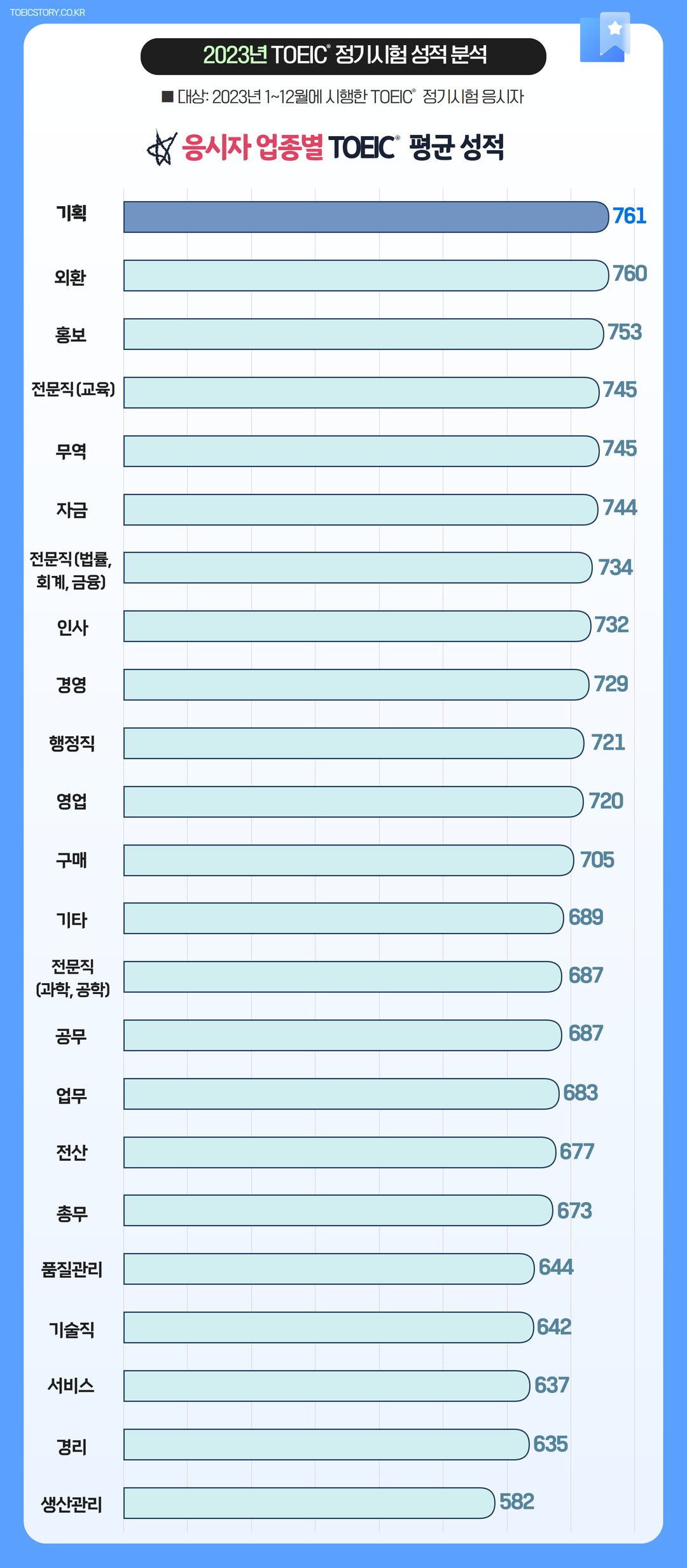 마지막으로 2023년 토익 정기시험 응시자 업종별 평균 성적 분석입니다. '기획' 업종 수험자 평균 성적이 761점으로 1위였습니다. :) 전년도(2022년)에서는 '외환' 업종이 1위였으나, 이번에는 1점 차이로 '외환' 업종이 2위가 되었네요.