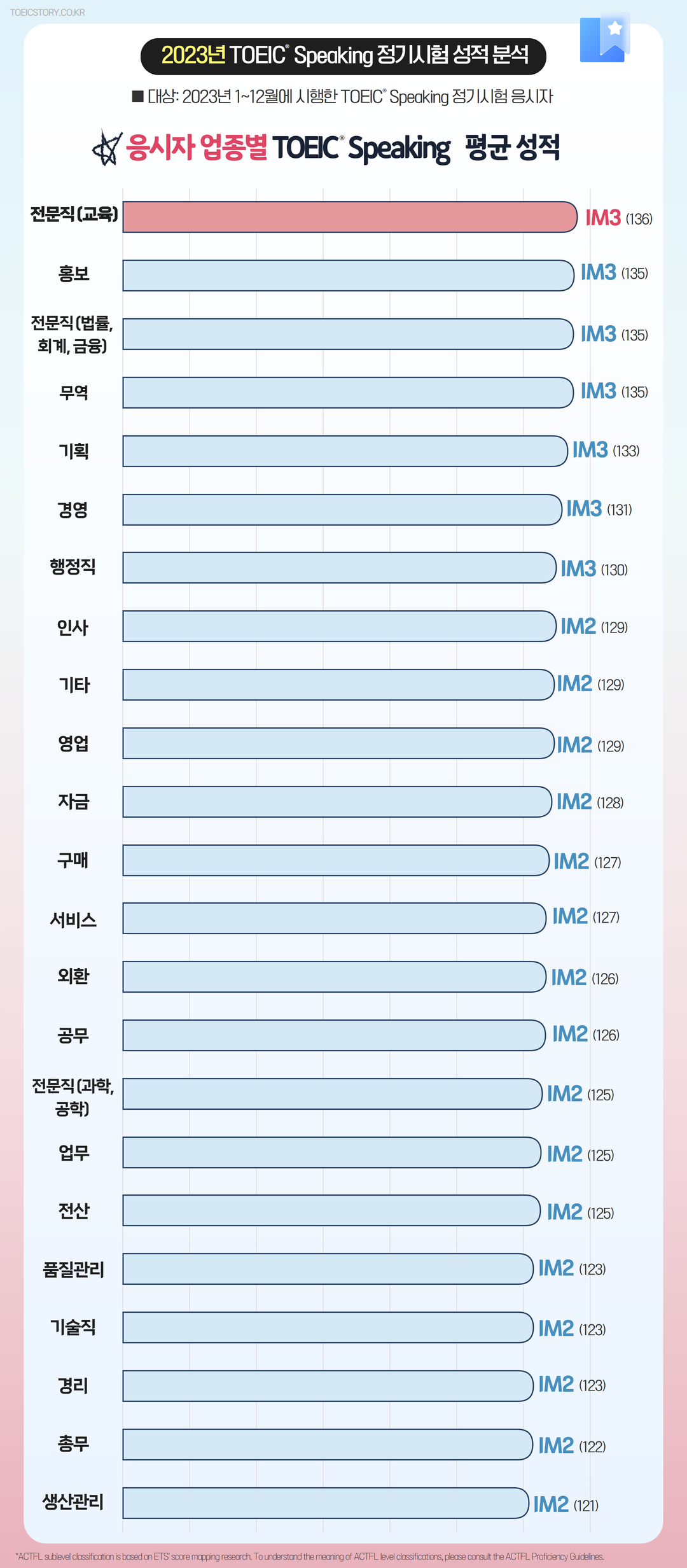 이어서 응시자 업종별 토익스피킹 평균 성적입니다. '전문직(교육)' 수험자의 평균 성적이 IM3(136점)로 가장 높았습니다. 전년도(2022년)와 동일한 결과였네요!