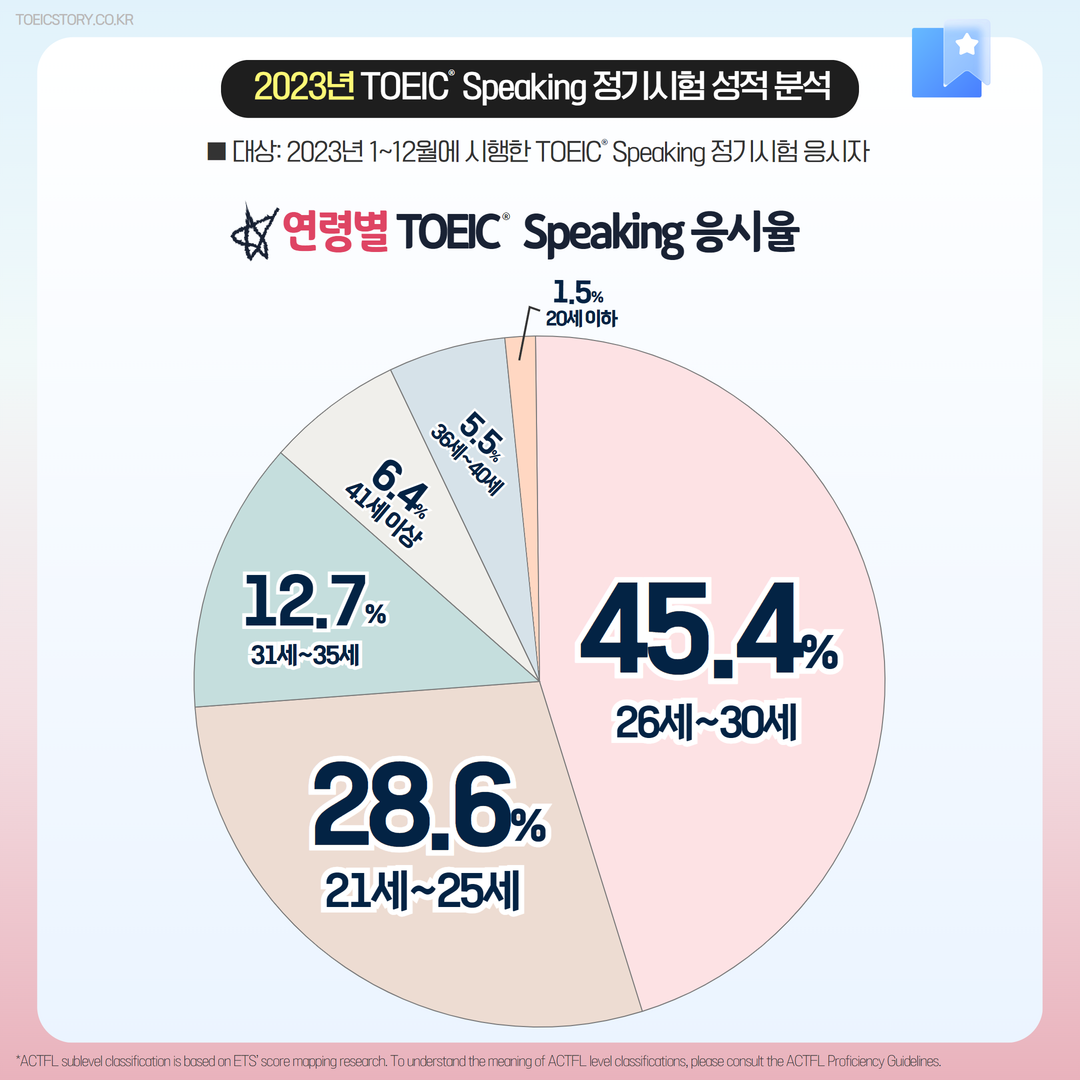 2023년 토익스피킹을 가장 많이 응시한 연령대는 '26세~30세(45.4%)'였습니다. 이어서 28.6%의 수치로 '21세~25세'가 2위를 차지했습니다. 토익스피킹 응시자 10명 중 7명은 21세~30세라는 사실을 확인할 수 있었죠.