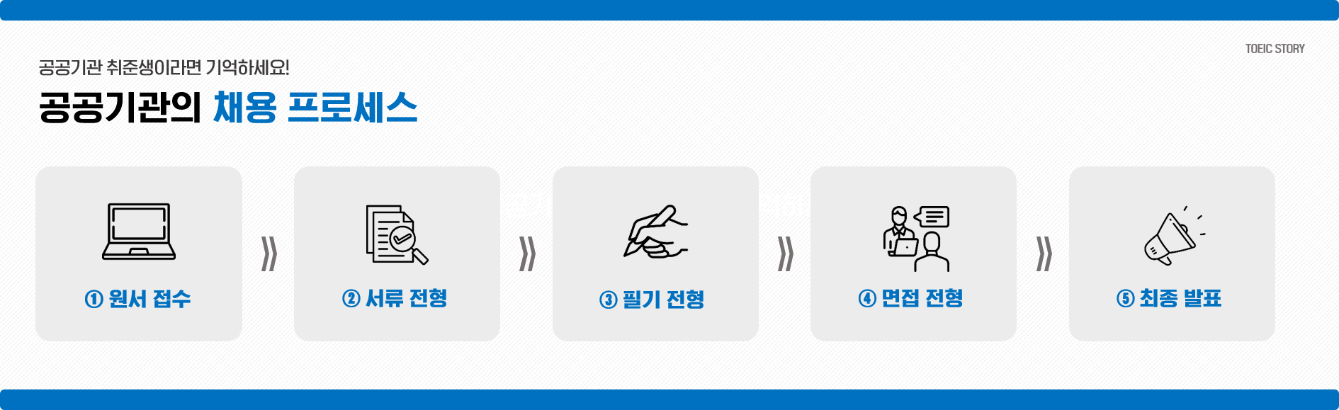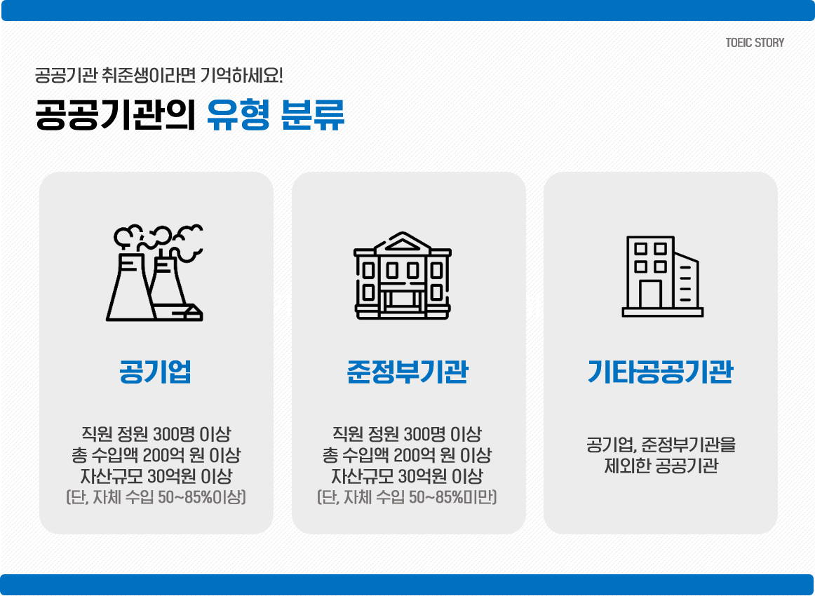 기획재정부에 따르면, 올해 공공기관의 신규 채용 규모는 2만 4,000명으로 지난해 목표 대비 약 10% 증가했습니다. 상대적으로 안정적인 근무 환경을 제공하는 공공기관은 취준생의 꾸준한 인기를 얻고 있는데요. 그러나, 공공기관 취업을 처음 준비하는 분들이라면 어디서부터 준비해야 할지 막막함을 느끼곤 하죠. 이에, 오늘 <토익스토리>에서는 공공기관의 유형과 NCS의 개념, 채용 프로세스 등에 대해 소개해 드리겠습니다. 바로 살펴보시죠!