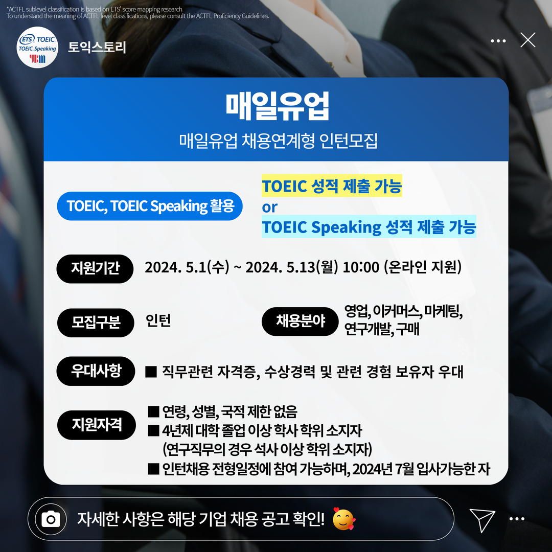 | 매일유업 | 인턴 | 2024년 인턴채용 (채용연계형) | 5.13(월) 10:00 | TOEIC 성적 제출 가능 or TOEIC Speaking 성적 제출 가능 |