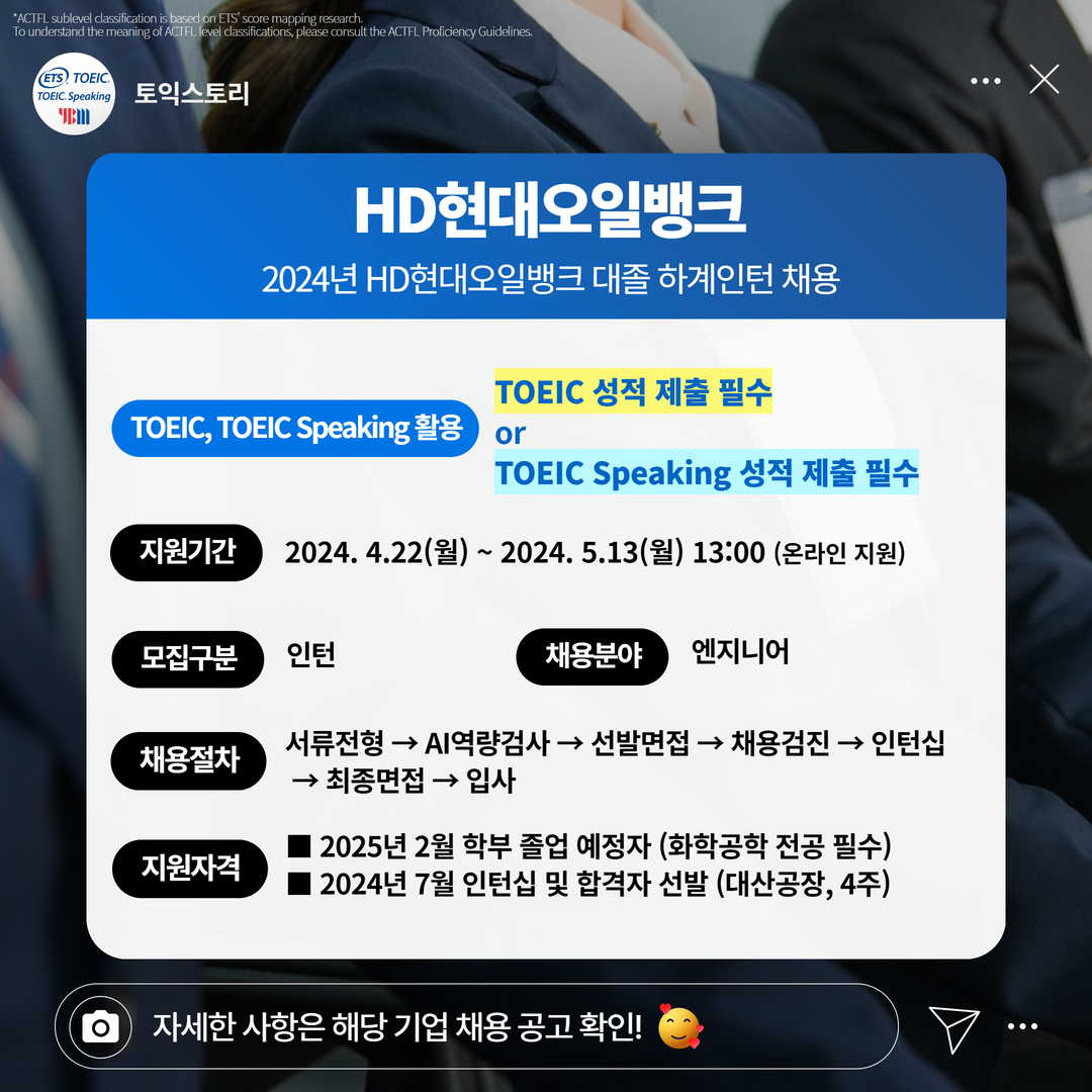 | HD현대오일뱅크 | 인턴 | 2024년 대졸 하계인턴 채용 | 5.13(월) 13:00 | TOEIC 성적 제출 필수 or TOEIC Speaking 성적 제출 필수 |
