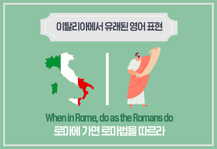 <토익스토리> 가족 여러분들은 ‘로마에 가면 로마법을 따르라’라는 표현이 어떻게 유래됐는지 알고 있나요? 우리가 자주 사용하는 영어 표현이 어디서 유래되었고, 어떤 속뜻을 담고 있는지 살펴보는 것은 그 나라의 문화에 대한 흥미로운 정보를 제공하는데요. 오늘 <토익스토리>에서는 유럽 국가에서 유래된 영어 표현들에 대해 소개해 드리겠습니다! :)