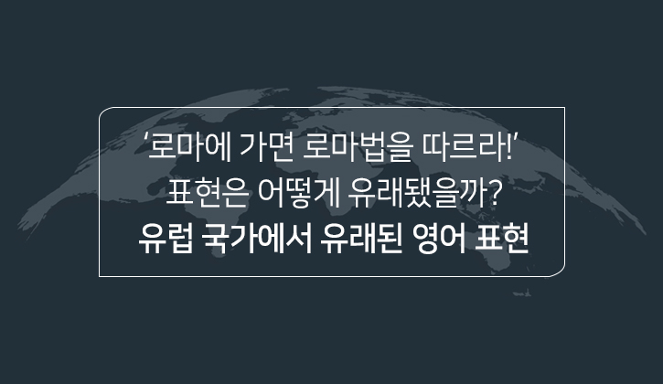 <토익스토리> 가족 여러분들은 ‘로마에 가면 로마법을 따르라’라는 표현이 어떻게 유래됐는지 알고 있나요? 우리가 자주 사용하는 영어 표현이 어디서 유래되었고, 어떤 속뜻을 담고 있는지 살펴보는 것은 그 나라의 문화에 대한 흥미로운 정보를 제공하는데요. 오늘 <토익스토리>에서는 유럽 국가에서 유래된 영어 표현들에 대해 소개해 드리겠습니다! :)