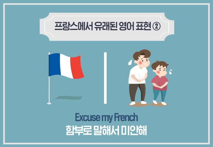 또 다른 영어 표현인 ‘Excuse my French(함부로 말해서 미안해)’는 사과의 의미로 사용되는데요. 중세 유럽의 영국과 프랑스는 사이가 좋지 못했습니다. 당시 영국과 프랑스는 전쟁으로 인하여 서로를 업신 여기는 용어를 만들어 사용했고, 이때 영국에서는 자신의 신사적이지 못한 말이 프랑스인과 같다는 의미로 쓰였죠.