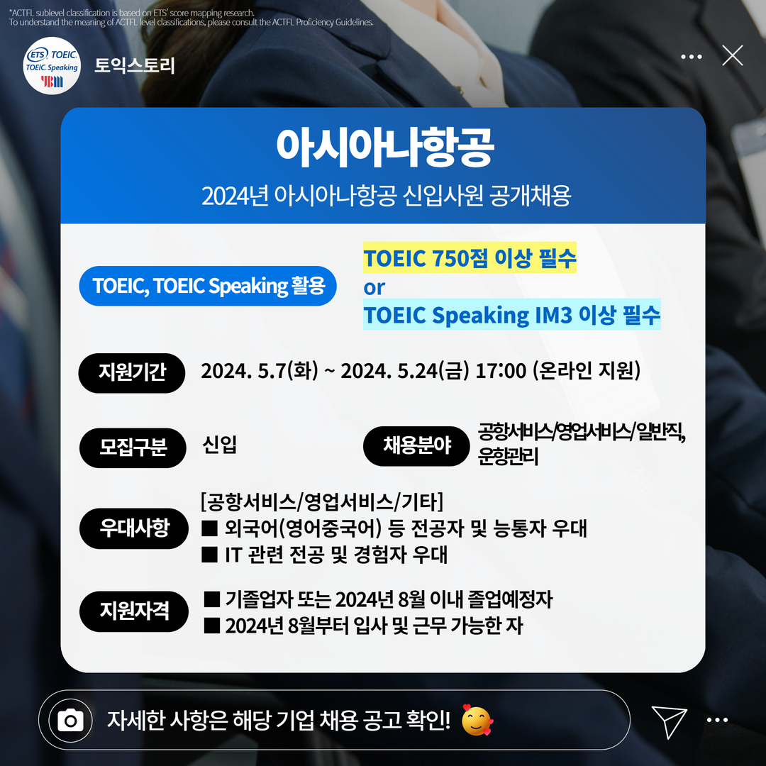| 아시아나항공 | 신입 | 2024년 아시아나항공 신입사원 공개채용 | 5.24(금) 17:00 | TOEIC 750점 이상 필수 or TOEIC Speaking IM3 이상 필수 |