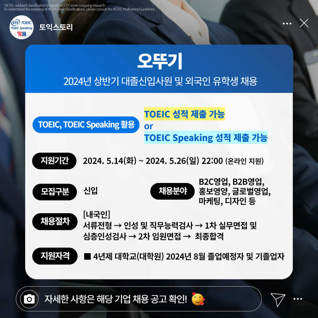 | 오뚜기 | 신입 | 2024년 상반기 대졸신입사원 및 외국인 유학생 채용 | 5.26(일) 22:00 | TOEIC 성적 제출 가능 or TOEIC Speaking 성적 제출 가능 |