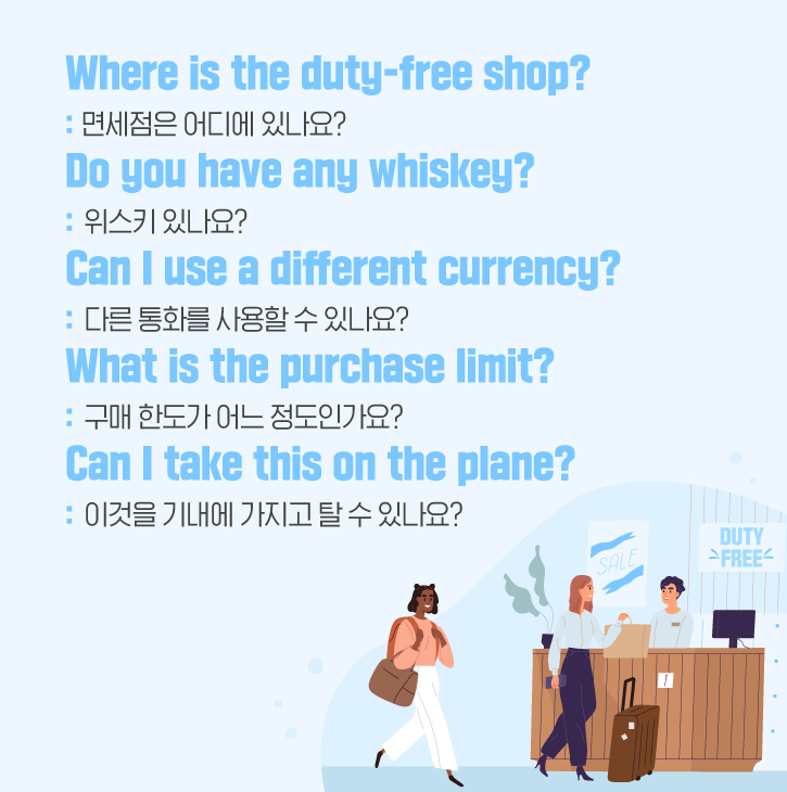 마지막으로, 해외 면세점에 들어갔을 때 활용할 수 있는 영어 회화 표현에 대해 알아보겠습니다. 낯선 여행지에서 면세점을 찾지 못하고 있다면, 공항 직원에게 ‘Where is the duty-free shop?(면세점은 어디에 있나요?)’이라고 물어볼 수 있습니다. 또, 부모님께 선물하기 위해 위스키를 구매하고 싶다면 직원에게 ‘Do you have any whiskey?(위스키 있나요?)’라고 물어볼 수 있겠네요.