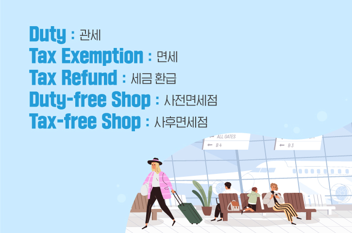 ‘Duty’는 수입품에 붙는 세금인 ‘관세’를 의미합니다. 흔히 세금을 말할 때 쓰는 ‘Tax’보다는 의미가 더 좁다고 볼 수 있겠네요. ‘Tax Exemption’은 ‘면세’를 의미하는데요. 승무원이나 공항 직원이 면세 서류를 작성하라고 할 때 주로 쓰는 표현으로, 면세를 위한 서류는 ‘Tax Exemption Document’라고 합니다! 작성한 면세 서류는 ‘Tax Refund(세금 환급)’를 위해 공항 내 키오스크 혹은 카운터에 찾아가 제출해야 하죠.