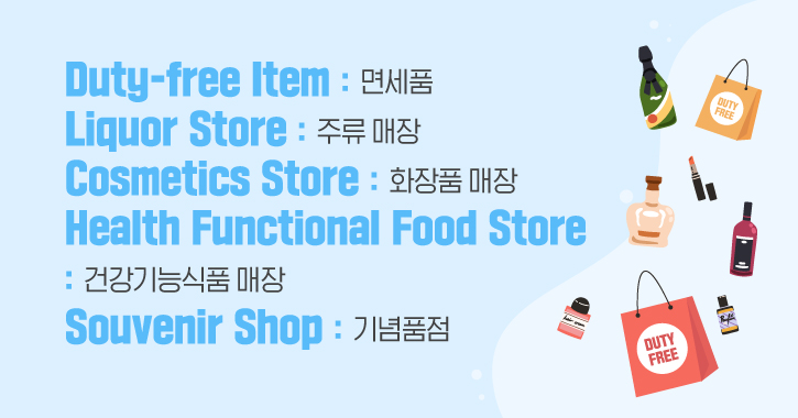 면세점에서는 다양한 상품을 관세가 면제된 가격으로 구매할 수 있습니다. 면세품은 영어로 ‘Duty-free Item(Tax-free Item)’이라고 하는데요. 공항 면세점의 경우 제품군 별로 매장이 나뉘어 있어 편리한 쇼핑이 가능합니다. 위스키나 와인 등 수입해오는 주류의 경우, 면세점의 ‘Liquor Store(주류 매장)’에서 저렴한 가격으로 구매할 수 있습니다. ‘Cosmetics Store(화장품 매장)’에서는 공항 면세점에서만 구매할 수 있는 귀여운 여행용 패키지를 팔기도 한답니다!