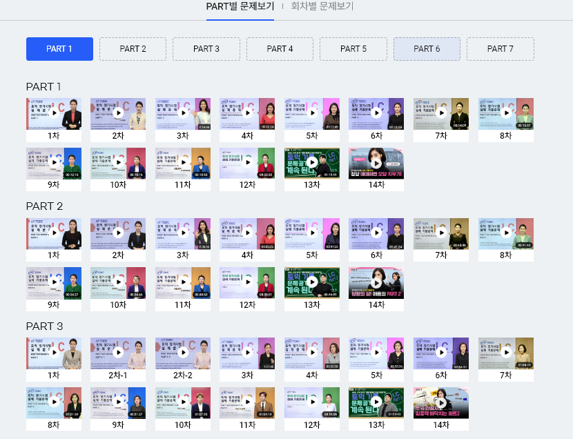 스크롤을 아래로 조금 내리면 'PART별 문제보기'가 보이는데요. 현재까지 공개된 모~든 실제 기출문제(1차~14차)들을 파트별로 확인하실 수 있습니다!