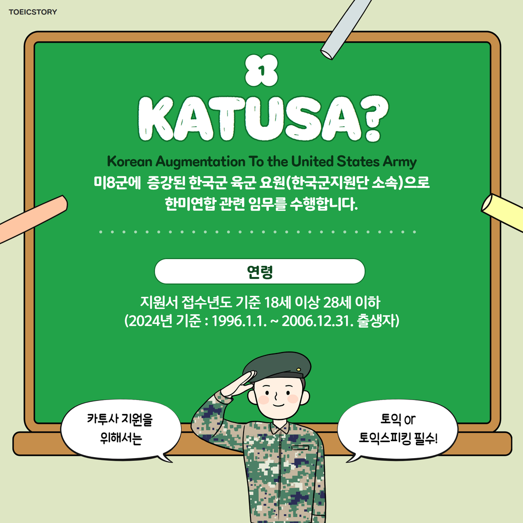 <토익스토리>가 전해드린 2025년도 입영 대상 카투사 모집 안내 소식! 꼼꼼하게 확인하셨나요? 카투사를 도전하시는 모든 분! 토익 또는 토익스피킹 성적을 활용하셔서 좋은 결과 있으시기 바라겠습니다.
