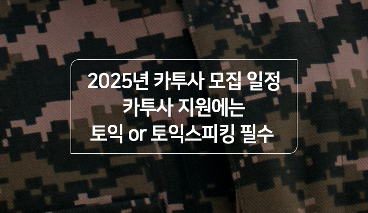 카투사를 준비하시는 분들이라면 이번 콘텐츠 꼼꼼하게 확인하셔야겠죠? 카투사는 미국에 배속된 한국 병사인 만큼, 지원 자격 중 토익 또는 토익스피킹 성적 제출이 필수입니다. 제출에 필요한 성적 기준, 지금 응시하면 접수기간에 맞출 수 있는 시험 일정까지 알려드립니다. 지금 확인해 보세요 :D