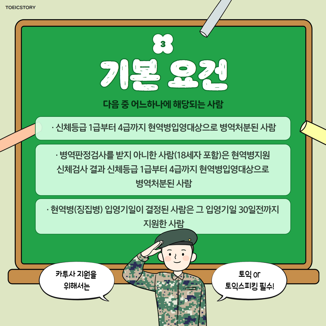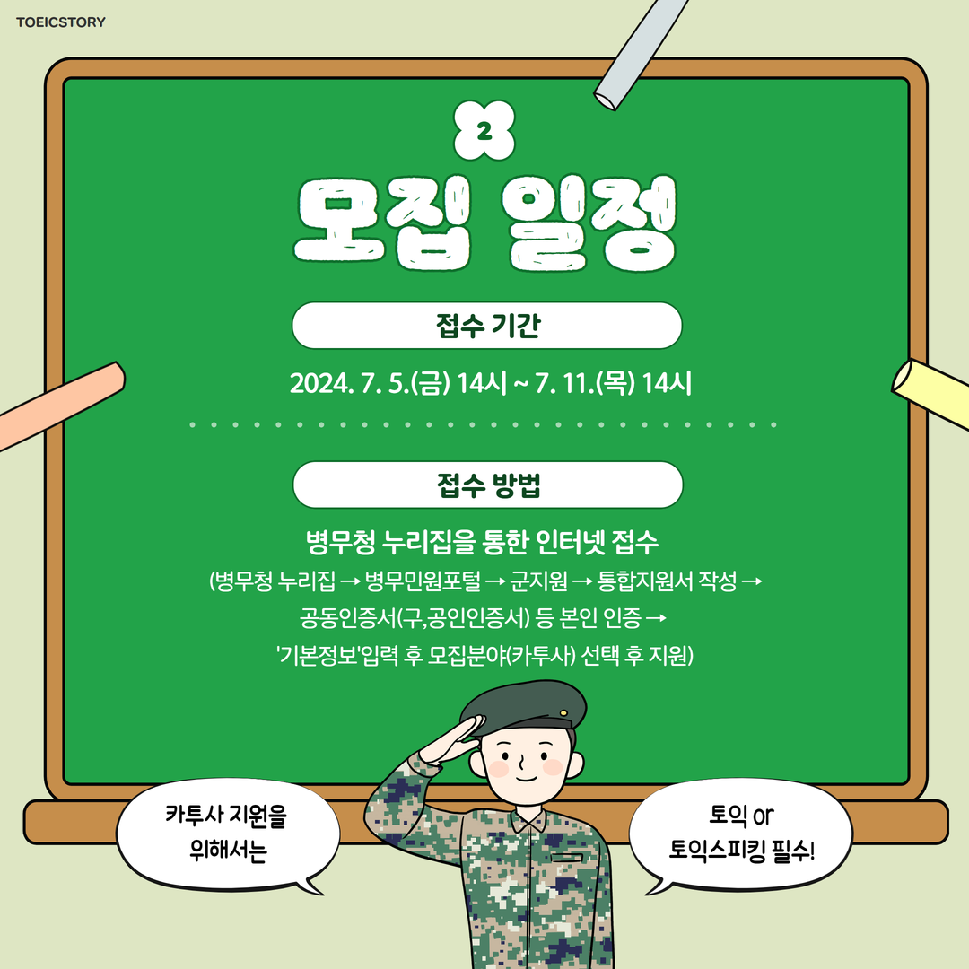 <토익스토리>가 전해드린 2025년도 입영 대상 카투사 모집 안내 소식! 꼼꼼하게 확인하셨나요? 카투사를 도전하시는 모든 분! 토익 또는 토익스피킹 성적을 활용하셔서 좋은 결과 있으시기 바라겠습니다.