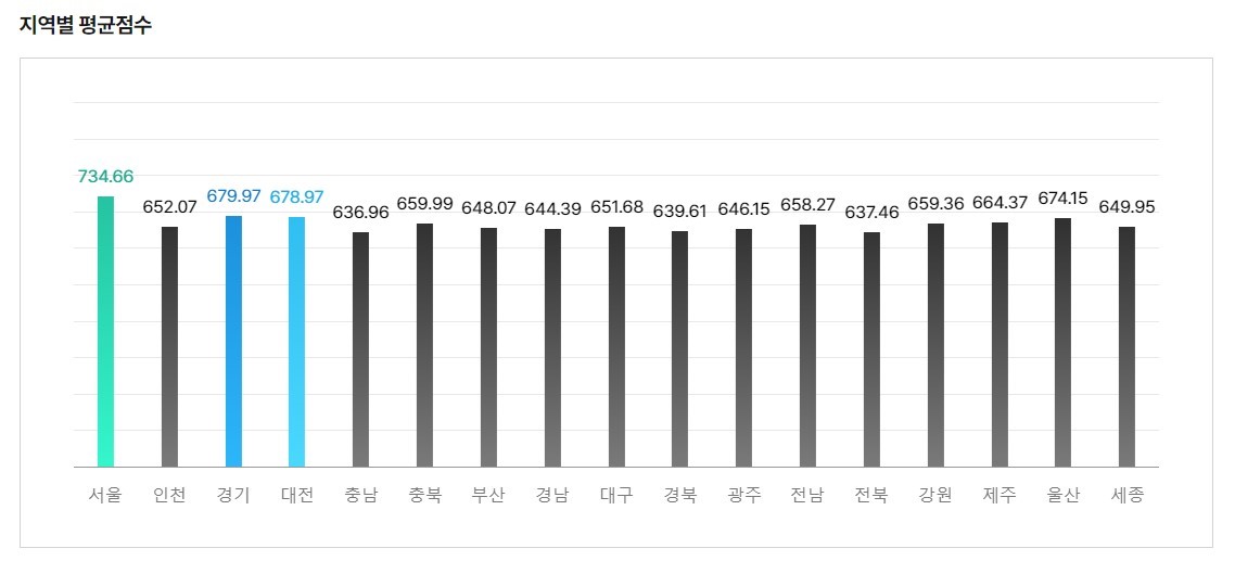 마지막으로, 지역별 평균 성적도 확인이 가능합니다! 토익 시험이 시행되는 17개 시도 △서울, △인천, △경기, △대전, △충남, △충북, △부산, △경남, △대구, △경북, △광주, △전남, △전북, △강원, △제주, △울산, △세종의 성적을 한눈에 확인해 볼 수 있죠!