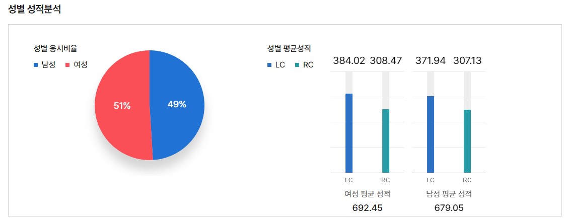 다음으로, 성별 성적 분석 서비스도 제공하는데요. 성별에 따른 토익시험 응시 비율과 여성, 남성의 LC&RC 성적을 각각 비교해 볼 수 있습니다.