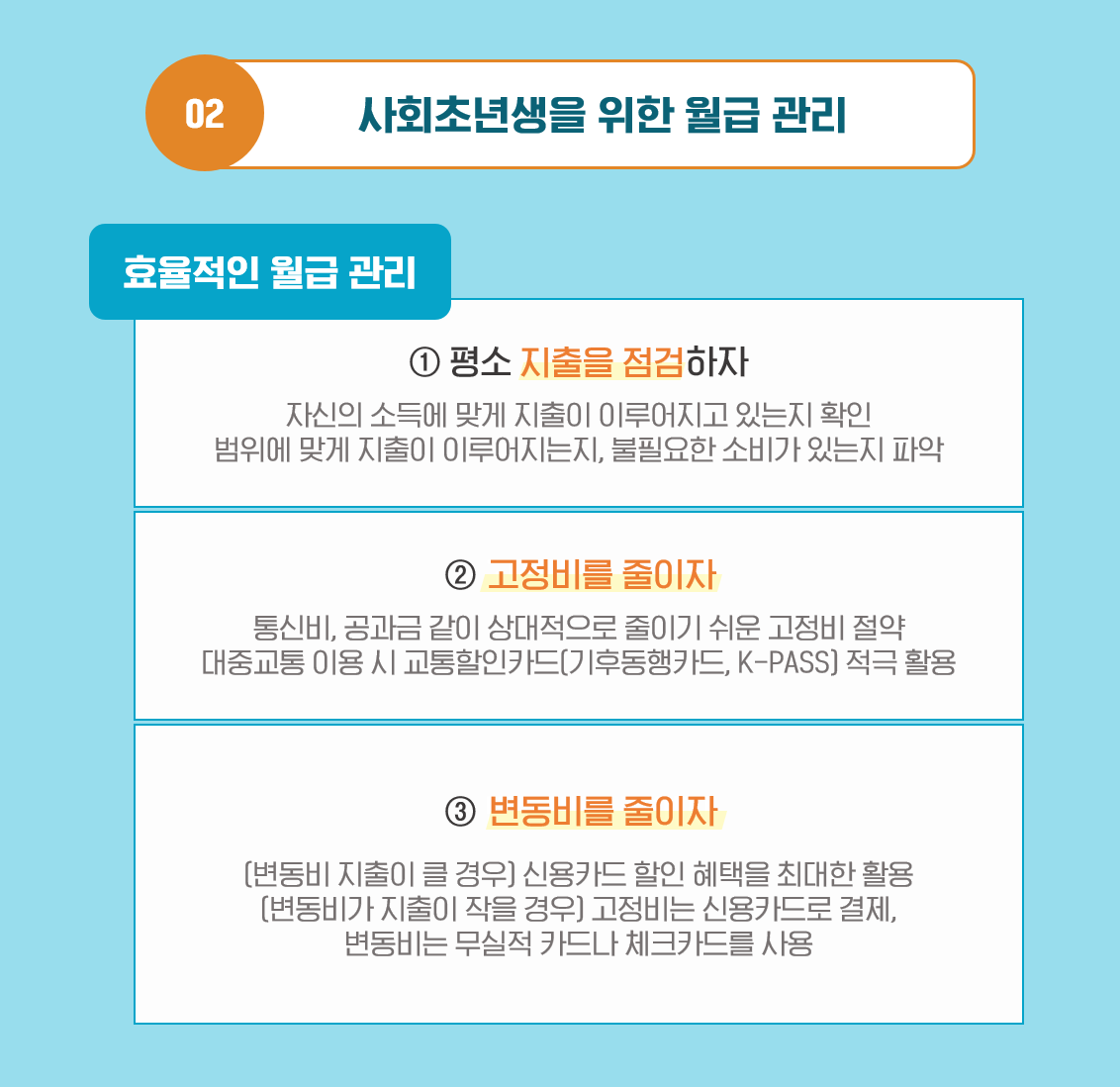 둘째로, 고정비를 줄이는 방법을 찾아보세요. 통신비나 공과금같이 상대적으로 줄이기 쉬운 고정 비용을 절약하고, 대중교통을 이용하는 사회초년생이라면 기후동행카드나 K-PASS와 같은 교통할인카드를 적극 활용해 보는 것도 좋은 방법이 될 것 같네요!