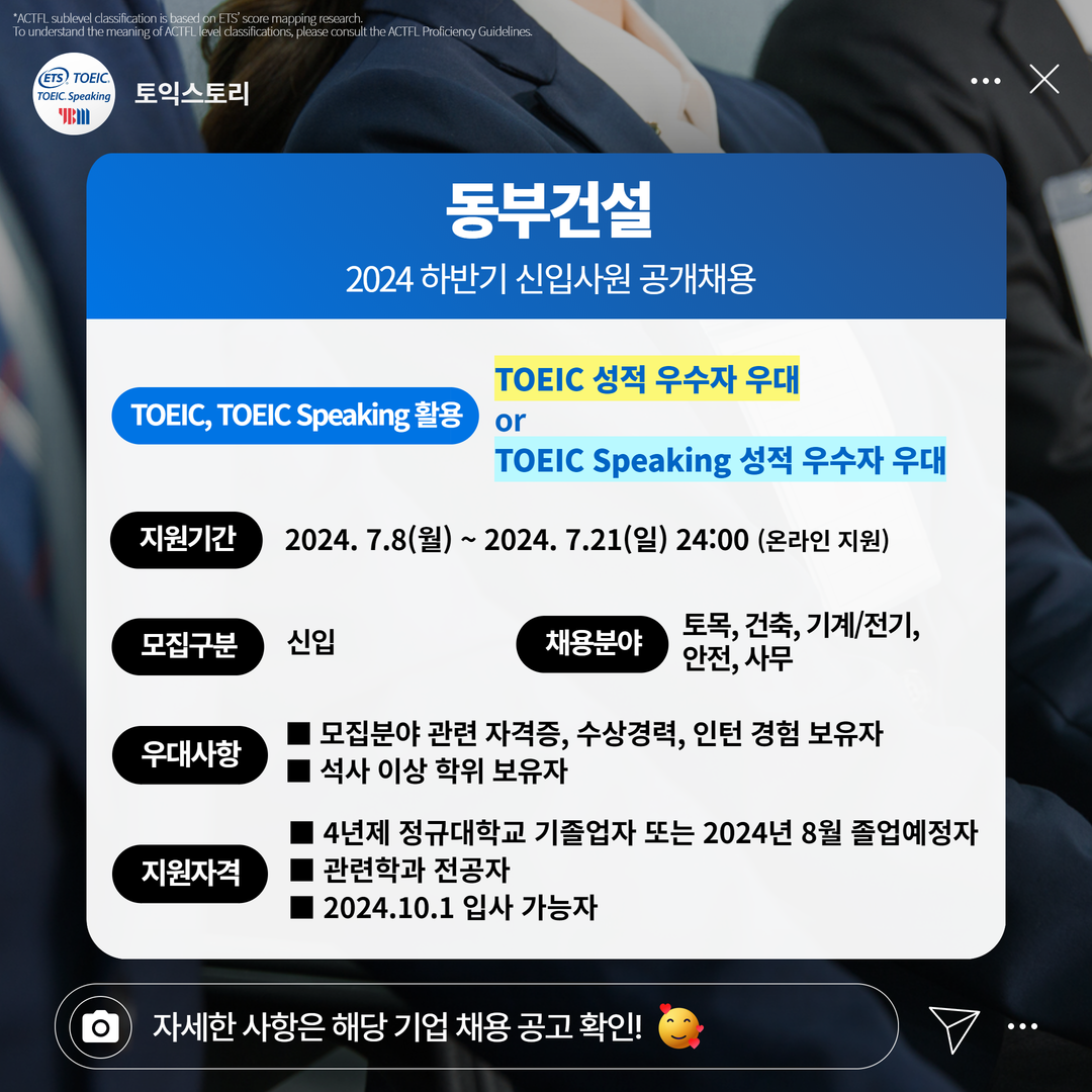 동부건설 신입 2024 하반기 신입사원 공개채용 7.21(일) 24:00 TOEIC 성적 우수자 우대