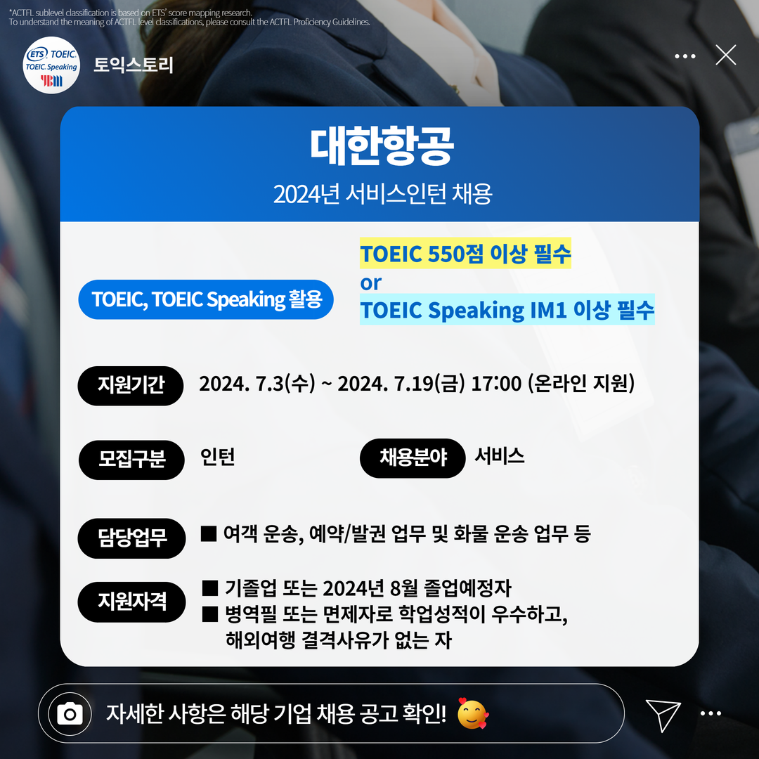대한항공 인턴 2024년 서비스인턴 채용 7.19(금) 17:00 TOEIC 550점 이상 필수