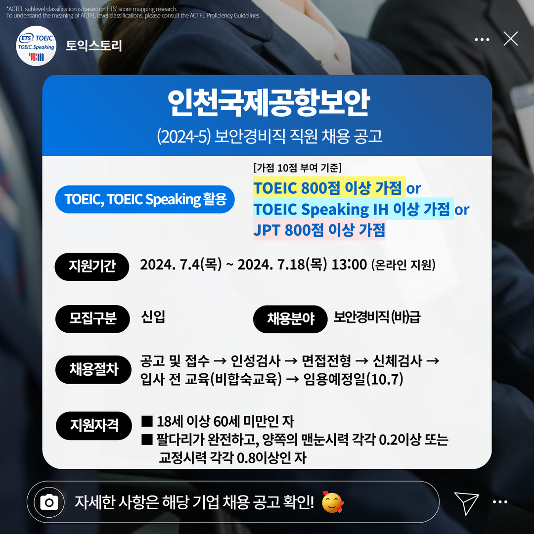 인천국제공항보안 신입 인천국제공항보안 주식회사(2024-5) 보안검색직 직원 채용 7.18(목) 13:00 TOEIC 800점 이상 가점 10점