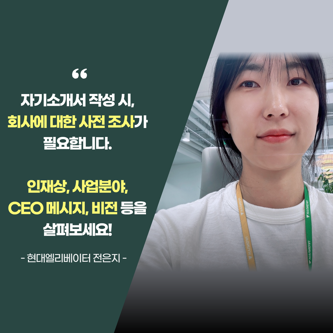 자기소개서 작성 시 특히 신입사원의 경우에는 본인의 경험과 우리 회사를 연결할 수 있는 것이 중요합니다. 이를 위해서는 회사에 대한 사전 조사도 필요하겠지요. 현대엘리베이터 홈페이지에서 인재상, 사업 분야, CEO 메시지, 비전 등을 살펴보고, 회사 관련 최신 뉴스나 ESG 보고서를 참고하면 관련 이슈를 확인하는 데 도움이 될 것 같습니다.
