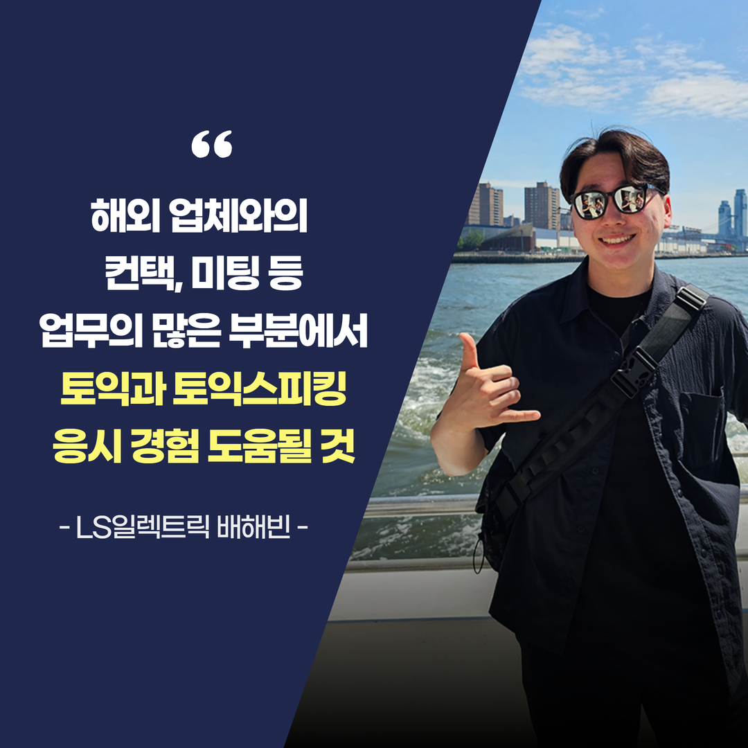 LS일렉트릭 배해빈 매니저님의 인터뷰, 재미있게 확인하셨나요? LS일렉트릭에서 영어가 차지하는 비중과 중요성에 대해 더욱 명확히 이해할 수 있었던 시간이었습니다. LS일렉트릭 입사를 희망하시는 분이라면, 실무에서의 레벨업을 위해 기본적인 영어 능력 함양은 필수라는 점 다시 알려드리면서! 토익과 토익스피킹 응시 경험이 여러분의 기본적인 영어 실력을 향상하는 것에 많은 도움이 되었으면 하는 바람입니다. 인터뷰에 응해주신 배해빈 매니저님께 깊은 감사를 드리며, <토익스토리>는 다음에도 좋은 분들의 인터뷰로 찾아오겠습니다. 다음에 만나요!