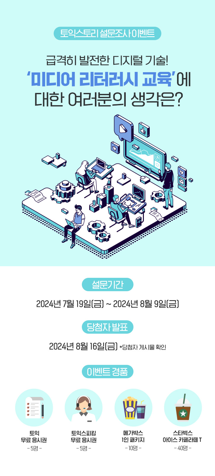 최근 미디어 사용량이 급격하게 증가하면서, '미디어 리터러시(Media Literacy)' 교육의 중요성이 그 어느 때보다 커지고 있습니다. 미디어 리터러시란, 미디어 콘텐츠를 비판적으로 분석하고 평가하여 그 안에서 전달되는 정보와 메시지를 올바르게 이해하는 능력을 말하는데요. 이는 미디어 콘텐츠를 분별력 있게 접하는 능력과 더불어, 인터넷 중독 예방, 책임감 있는 미디어 에티켓 정립 등 디지털 웰빙의 기초가 되어주기 때문에 그 중요성이 더욱 강조되고 있습니다. <토익스토리> 가족 여러분들은미디어 리터러시 교육에 대해 어떤 생각을 갖고 있는지 다양한 의견을 공유해 주세요!