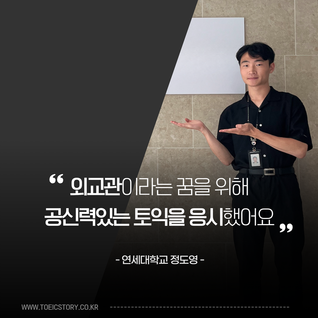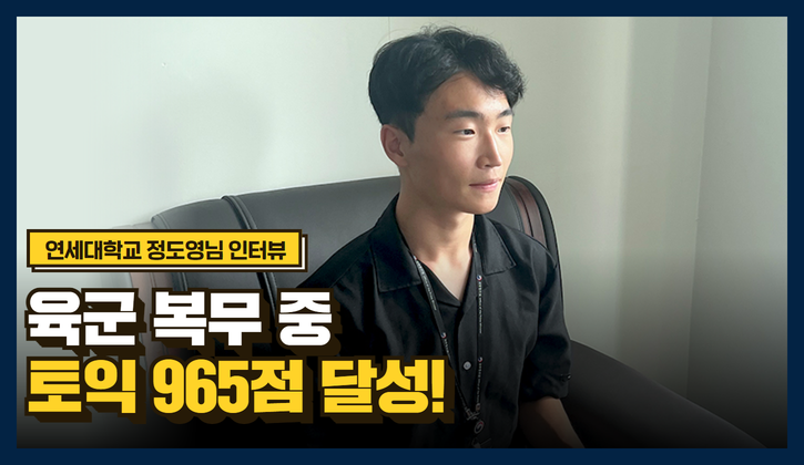 지금까지 연세대학교 정치외교학과 정도영 님의 토익스토리를 전해드렸습니다. 확고한 비전과 열정을 확인할 수 있었던 시간이었는데요. 도영 님은 군인 신분이라는 제한된 환경 속에서도 좋은 성적을 도출해 낸 만큼, 보다 많은 사람들이 영어에 대한 두려움을 허물고 주저 없이 공부했으면 좋겠다는 메시지를 전하기 위해 <토익스토리> 인터뷰이에 지원했다고 합니다. 이를 통해 한국의 글로벌 경쟁력이 한층 더 나아갔으면 하는 바람이라는데요.