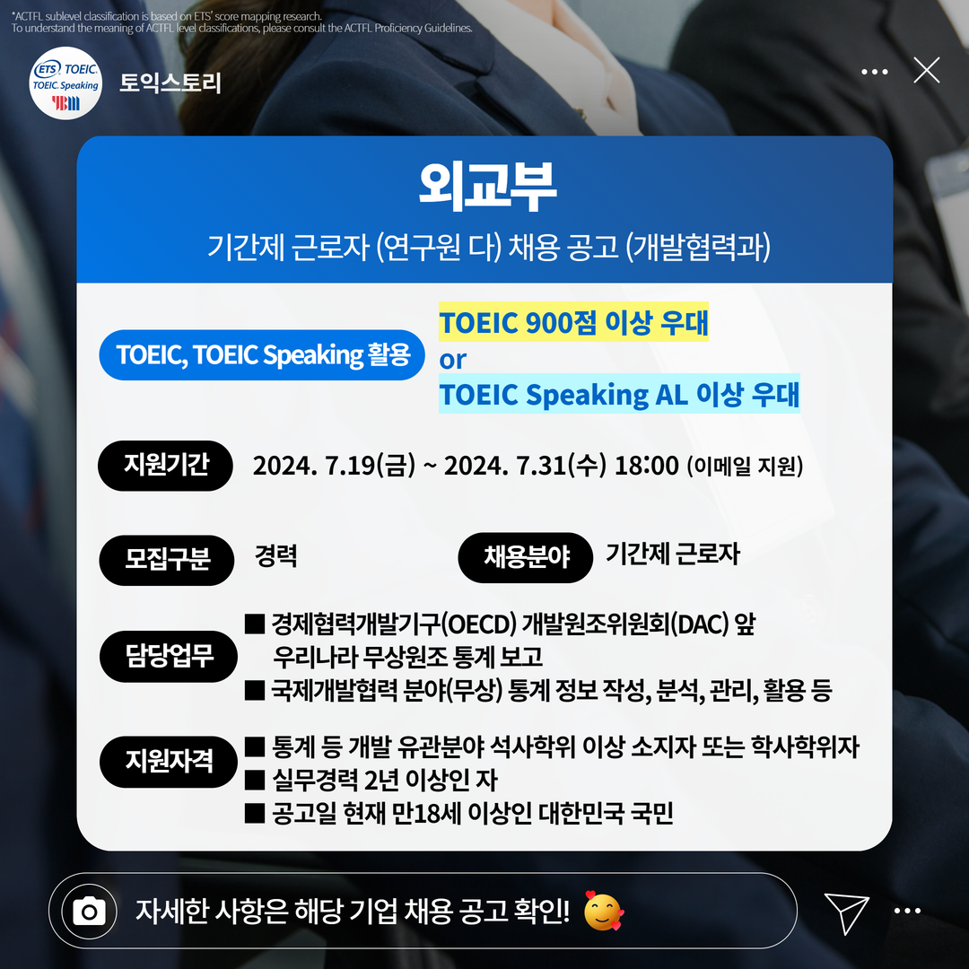 | 외교부 | 경력 | 기간제 근로자(연구원 다) 채용 공고 | 7.31(수) 18:00 | TOEIC 900점 이상 우대 or TOEIC Speaking AL 이상 필수 |