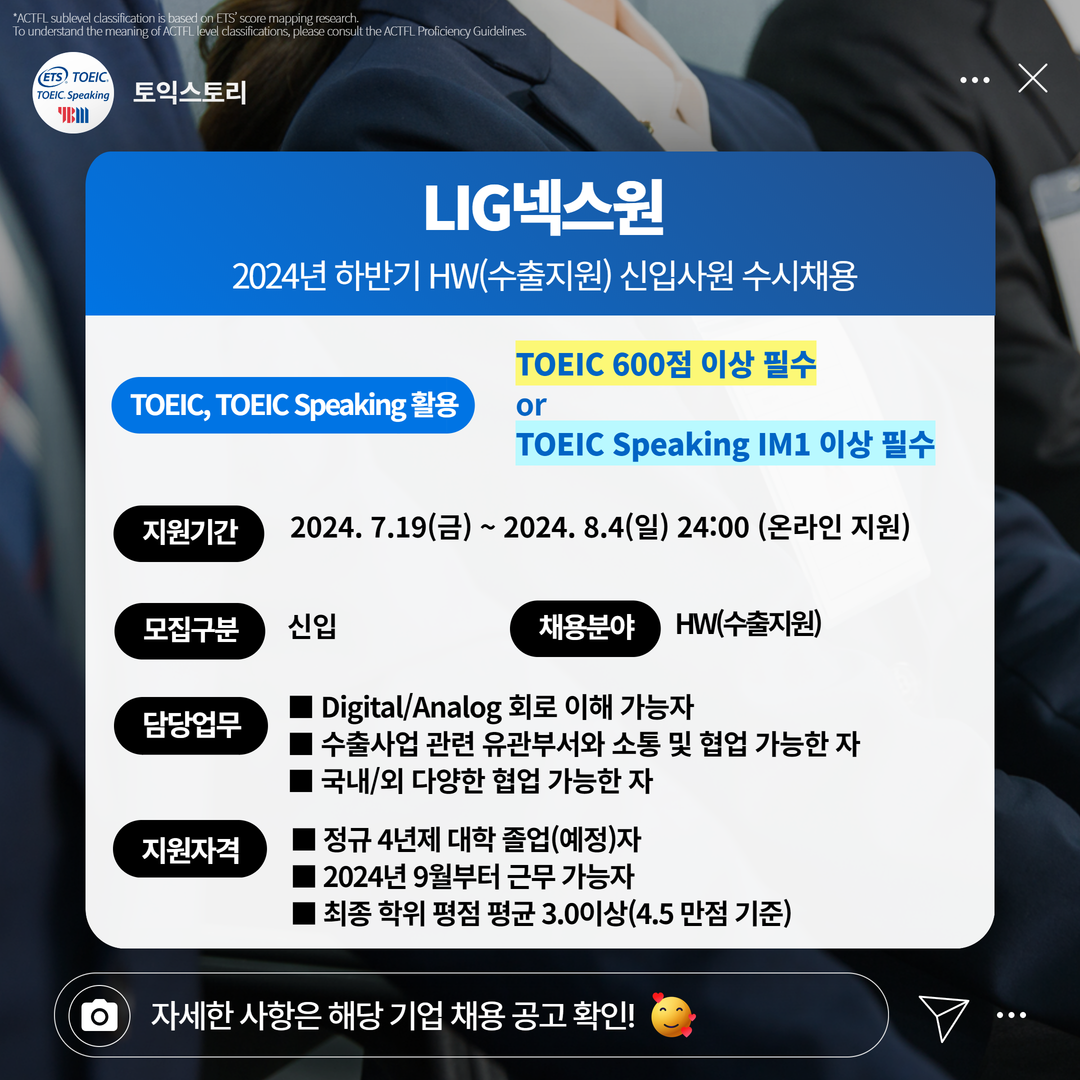 | LIG넥스원 | 신입 | 2024년 하반기 HW(수출지원) 신입사원 수시채용 | 8.4(일) 24:00 | TOEIC 600점 이상 필수 or TOEIC Speaking IM1 이상 필수 |