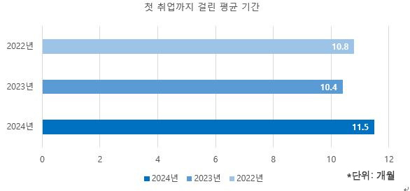 그렇다면, 청년층이 첫 취업까지 걸리는 시간은 어떻게 될까요? 2024년 청년층의 첫 취업 소요 기간을 분석한 결과, 임금을 받는 첫 직장에 취직하기까지 평균 11.5개월이 소요됐습니다. 이는 지난해에 비해 1.1개월 증가한 수치로, 조사 이래 최장 기간을 기록했습니다.