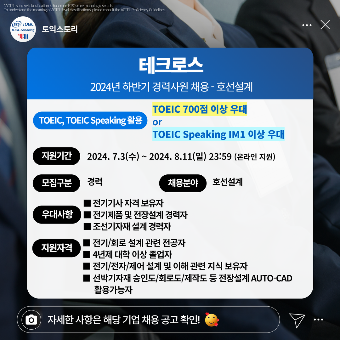 | 테크로스 | 경력 | 2024년 하반기 경력사원 채용 - 호선설계 | 8.11(일) 23:59 | TOEIC 700점 이상 우대 or TOEIC Speaking IM1 이상 우대 |