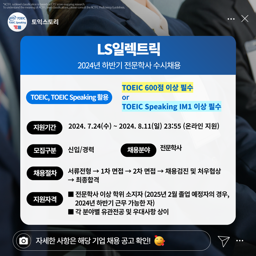 | LS일렉트릭 | 신입/경력 | 2024년 하반기 전문학사 수시채용 | 8.11(일) 23:55 | TOEIC 600점 이상 필수 or TOEIC Speaking IM1 이상 필수 |