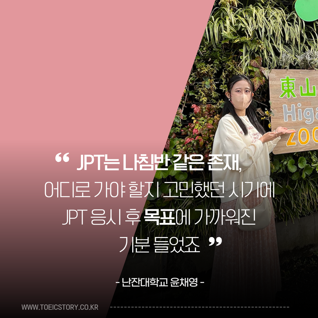 지금까지 윤채영 님의 스토리를 전해드렸습니다. 먼 타지에서 유학 생활을 하시는 것이 결코 쉬운 일은 아니셨을 텐데요. 일본 유학을 꿈꾸시는 분들께 주신 조언 속에서 채영 님의 긍지를 느낄 수 있었던 시간이었습니다. 오늘의 인터뷰가 많은 분들께 도움이 되셨으면 하는 바람입니다. 더불어 JPT는 일본어 실력을 증명하고, 목표에도 한 걸음 가까워질 수 있는 조력자입니다. JPT를 통해 원하는 꿈을 모두 이루시기 바라며! <토익스토리>가 항상 응원하겠습니다.