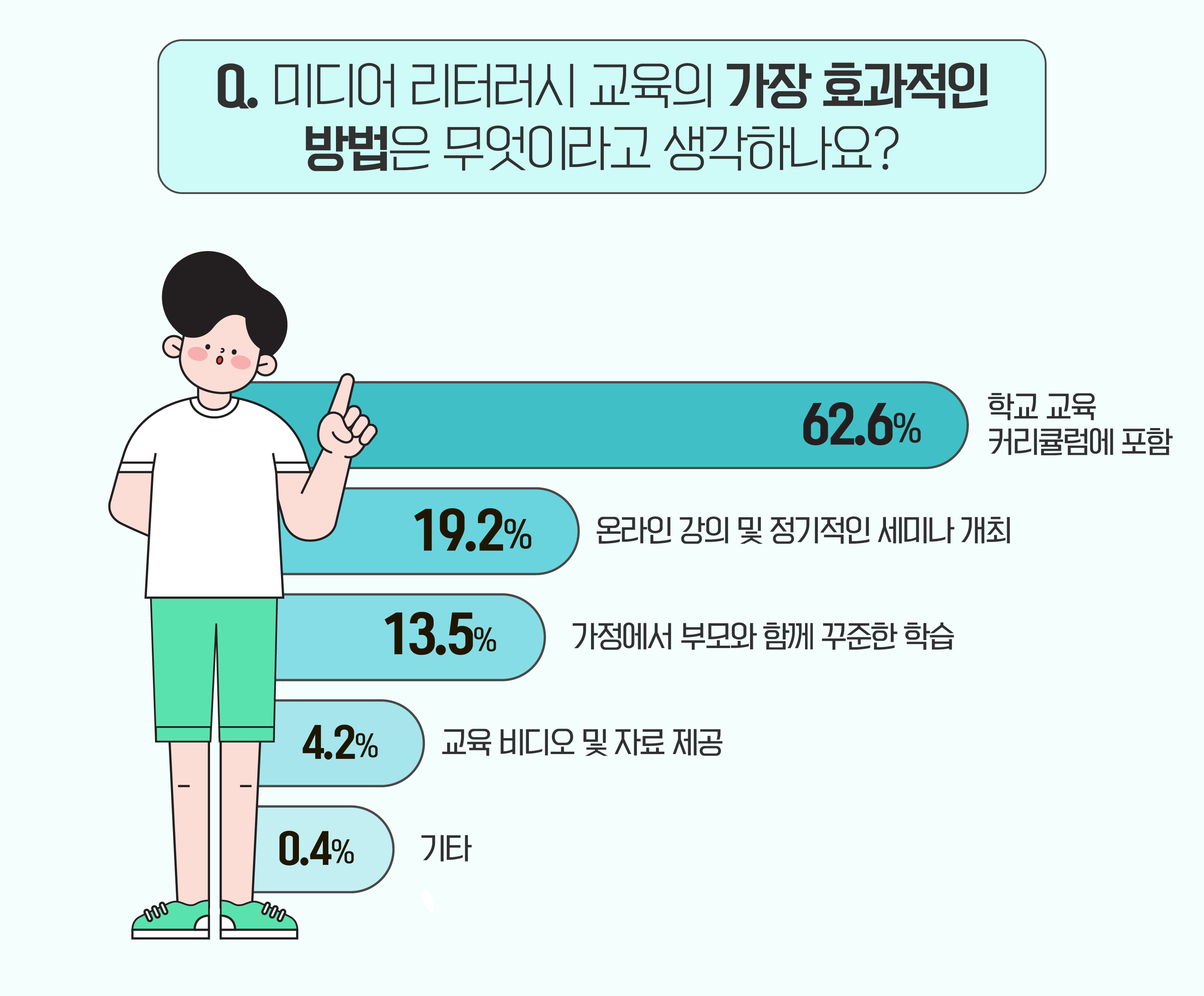 이어서 미디어 리터러시 교육의 효과적인 교육 방법에 대해 질문했는데요. ‘학교 교육 커리큘럼에 포함’을 선택한 응답자가 62.6%로 가장 많았습니다. ‘온라인 강의 및 정기적인 세미나 개최’가 19.2%를 차지했으며, ‘가정에서 부모와 함께 꾸준한 학습’이 13.5%로 뒤를 이었습니다. ‘교육 비디오 및 자료 제공’은 4.2%의 응답률을 기록했으며, ‘기타’는 0.4%로 나타났습니다.