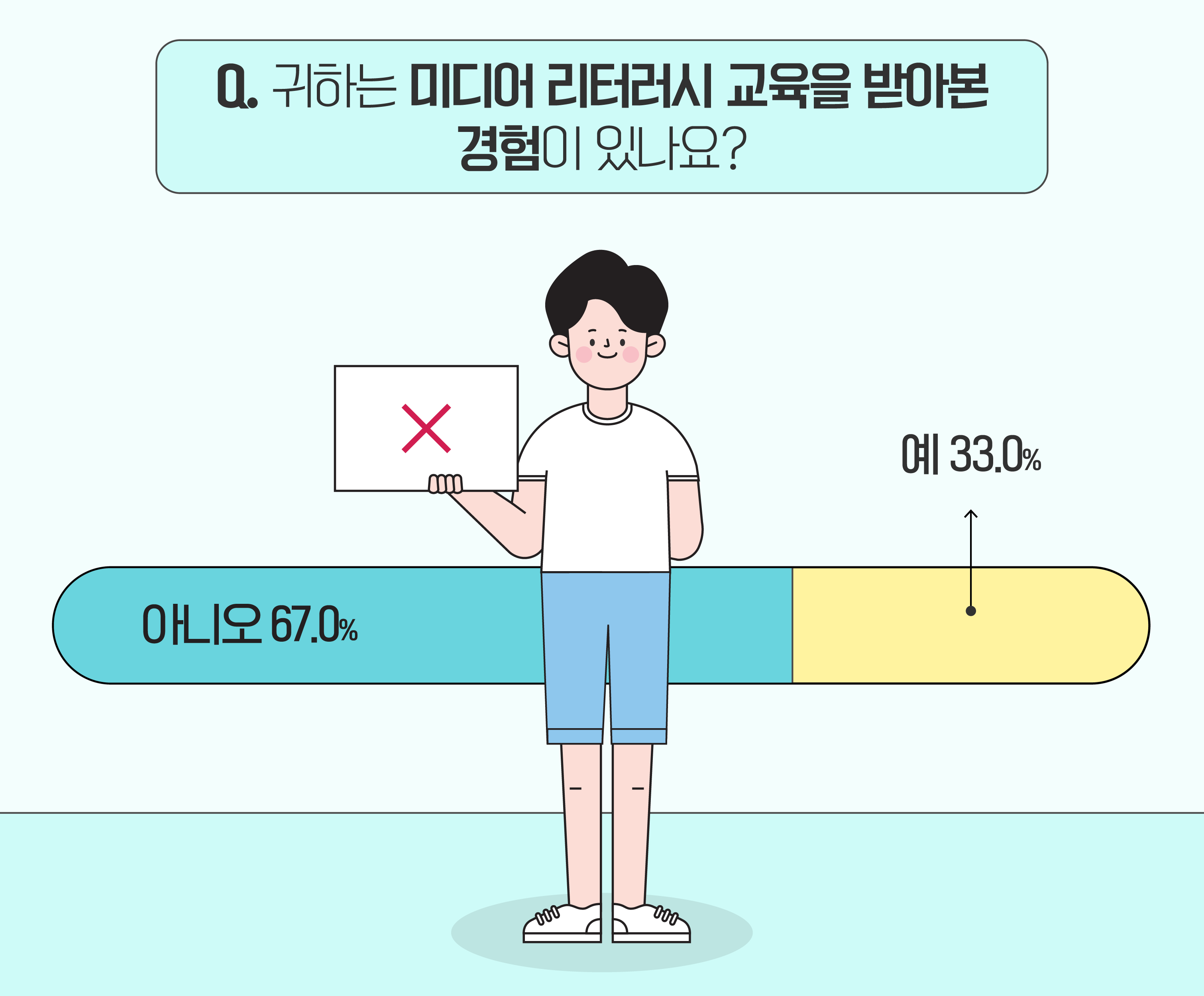 다음으로, 미디어 리터러시 교육을 받아 본 경험이 있는지 물었습니다. 설문 응답자 중 33%만이 ‘예’라고 답했으며, 67%는 ‘아니오’라고 답했는데요. 이는 응답자의 약 3분의 2가 ‘미디어 리터러시 교육을 받아 본 경험이 없다’는 것을 의미합니다.