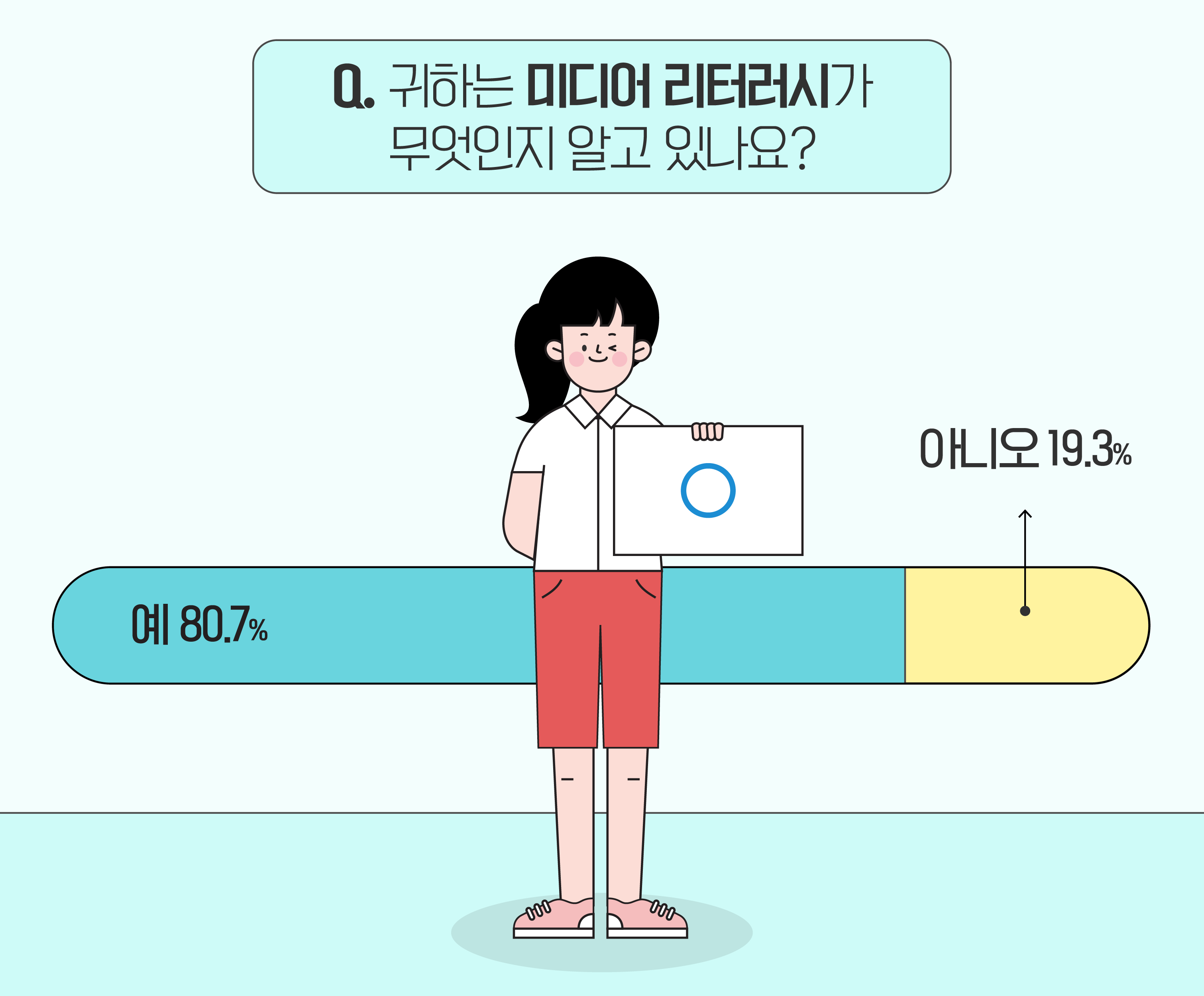 본격적인 첫 질문으로, 설문 응답자들에게 미디어 리터러시의 개념을 알고 있는지 물었습니다. 설문 결과에 따르면, 응답자 10명 중 8명(80.7%)은 미디어 리터러시에 대해 알고 있다고 답했는데요. 이 결과를 미루어 봤을 때, 미디어 리터러시라는 개념이 상당히 널리 알려져 있음을 확인해 볼 수 있었습니다. :)