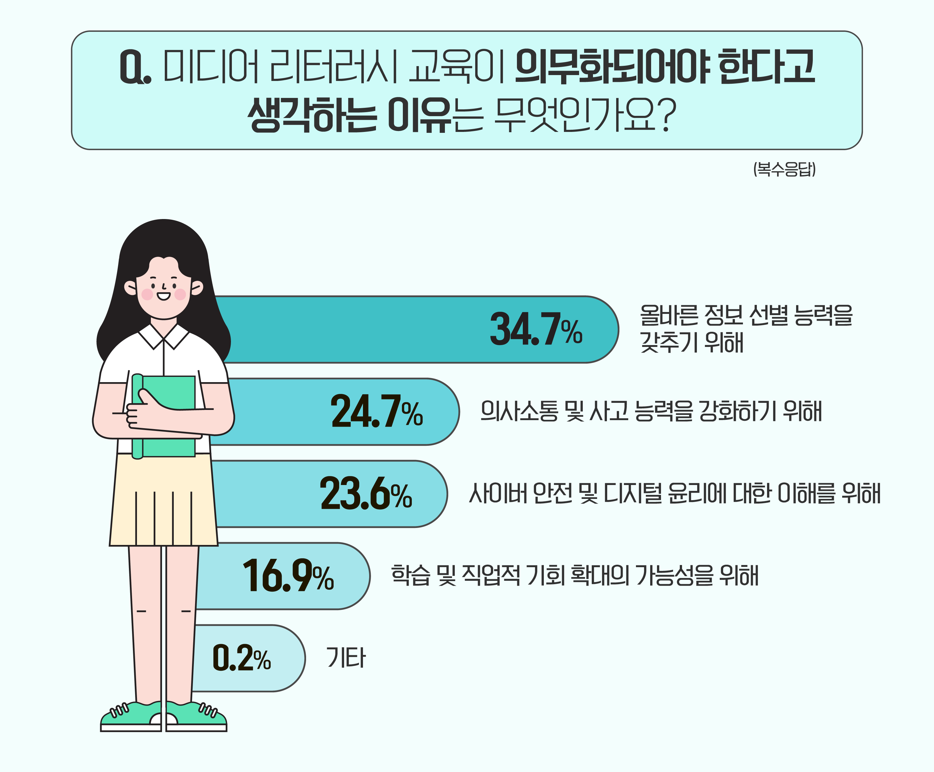 먼저, 34.7%가 ‘올바른 정보 선별 능력을 갖추기 위해’라고 답했습니다. 이어 24.7%는 ‘의사소통 및 사고 능력 강화를 위해’, 23.6%는 ‘사이버 안전 및 디지털 윤리에 대한 이해를 위해’ 의무화가 필요하다고 응답했습니다. 또, 16.9%는 ‘학습 및 직업적 기회 확대의 가능성을 위해’를 이유로 들었으며, ‘기타’는 0.2%로 나타났습니다.