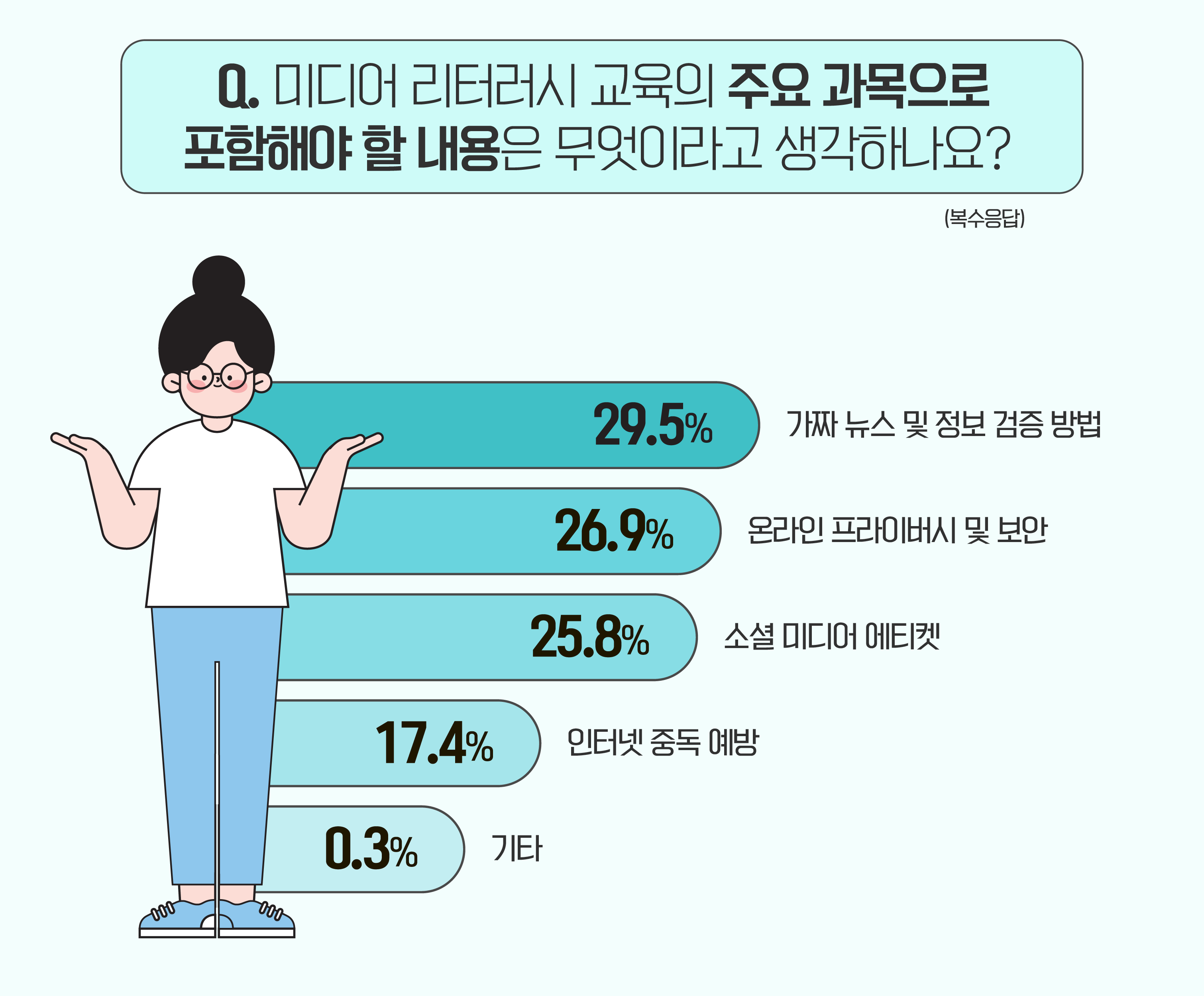 미디어 리터러시 교육의 주요 과목으로 포함해야 할 내용을 묻자, 29.5%의 응답자들이 ‘가짜 뉴스 및 정보 검증 방법’을 꼽았습니다. 다음으로 ‘온라인 프라이버시 및 보안’이 26.9%를 차지했고, ‘소셜 미디어 에티켓’이 25.8%로 그 뒤를 이었습니다. ‘인터넷 중독 예방’은 17.4%의 응답을 차지했으며, ‘기타’는 0.3%에 그쳤습니다.