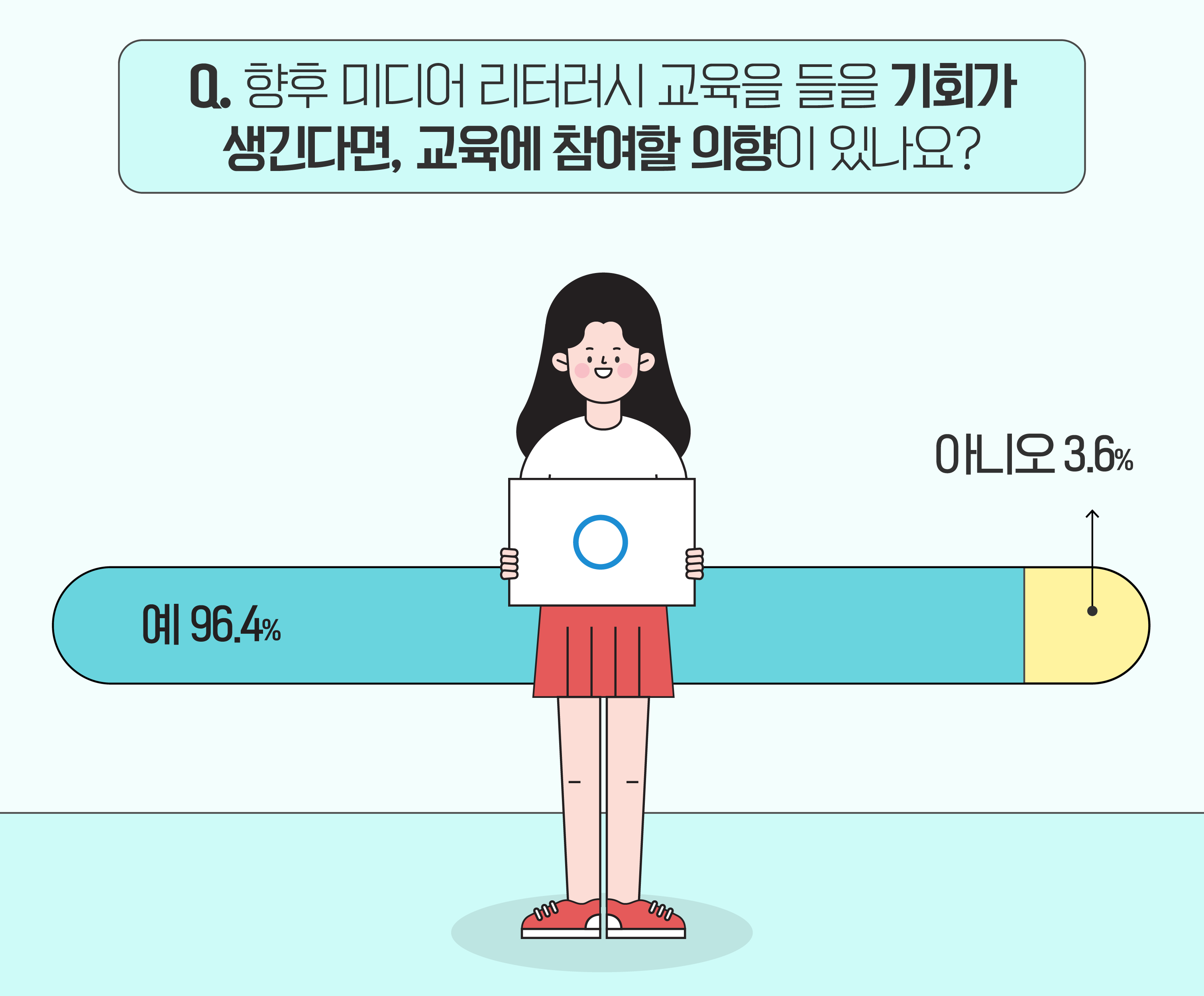 향후 응답자들은 향후 미디어 리터러시 교육을 들을 기회가 생긴다면, 교육에 참여할 의향이 있을까요? 무려 96.4%의 응답자가 교육 참여에 대한 긍정적인 반응을 보였는데요.