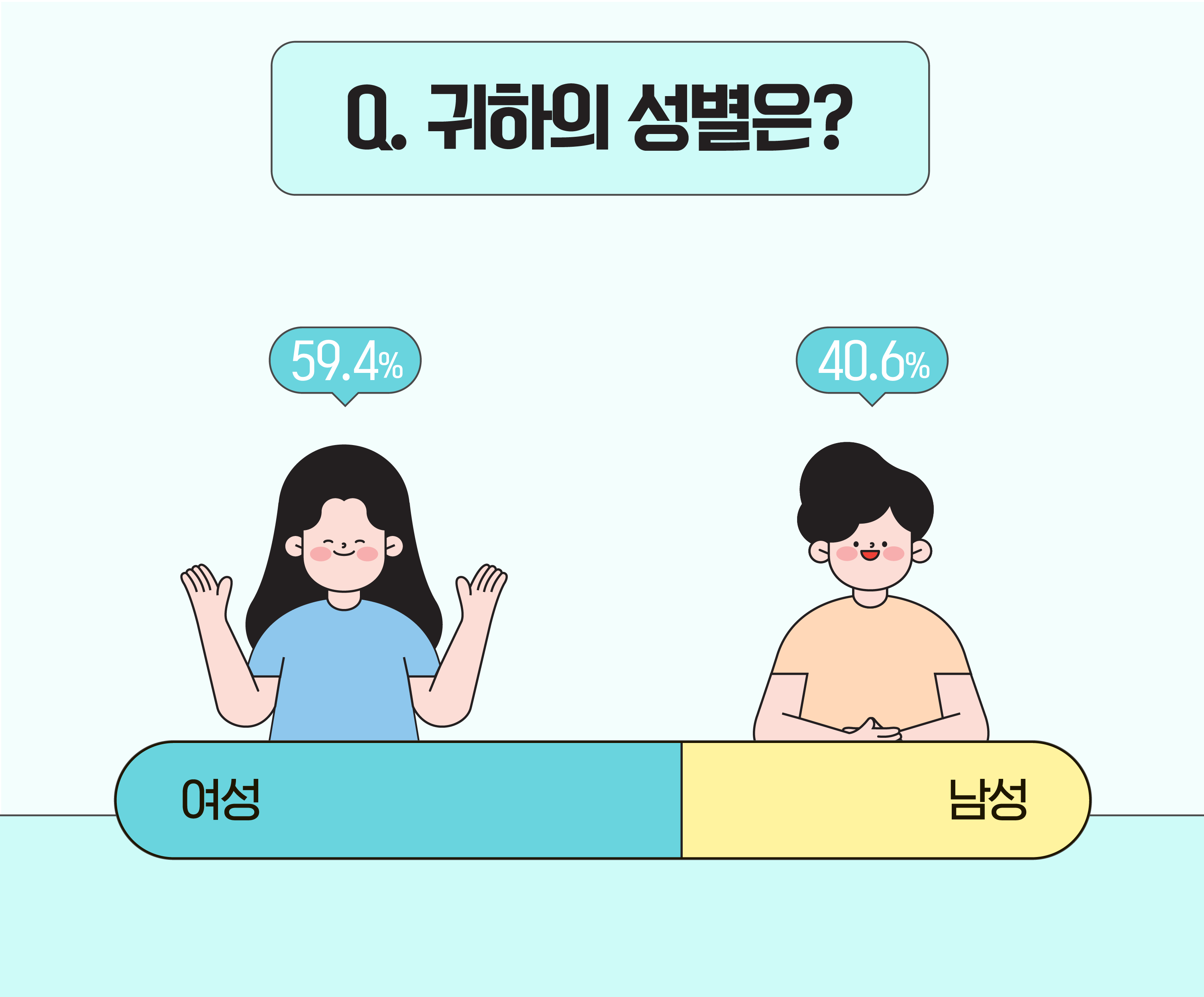 이어서 설문 참여자의 성비는 ‘여성’이 59.4%, ‘남성’이 40.6%로 이번 설문조사는 여성의 비율이 더 높게 나타났네요!