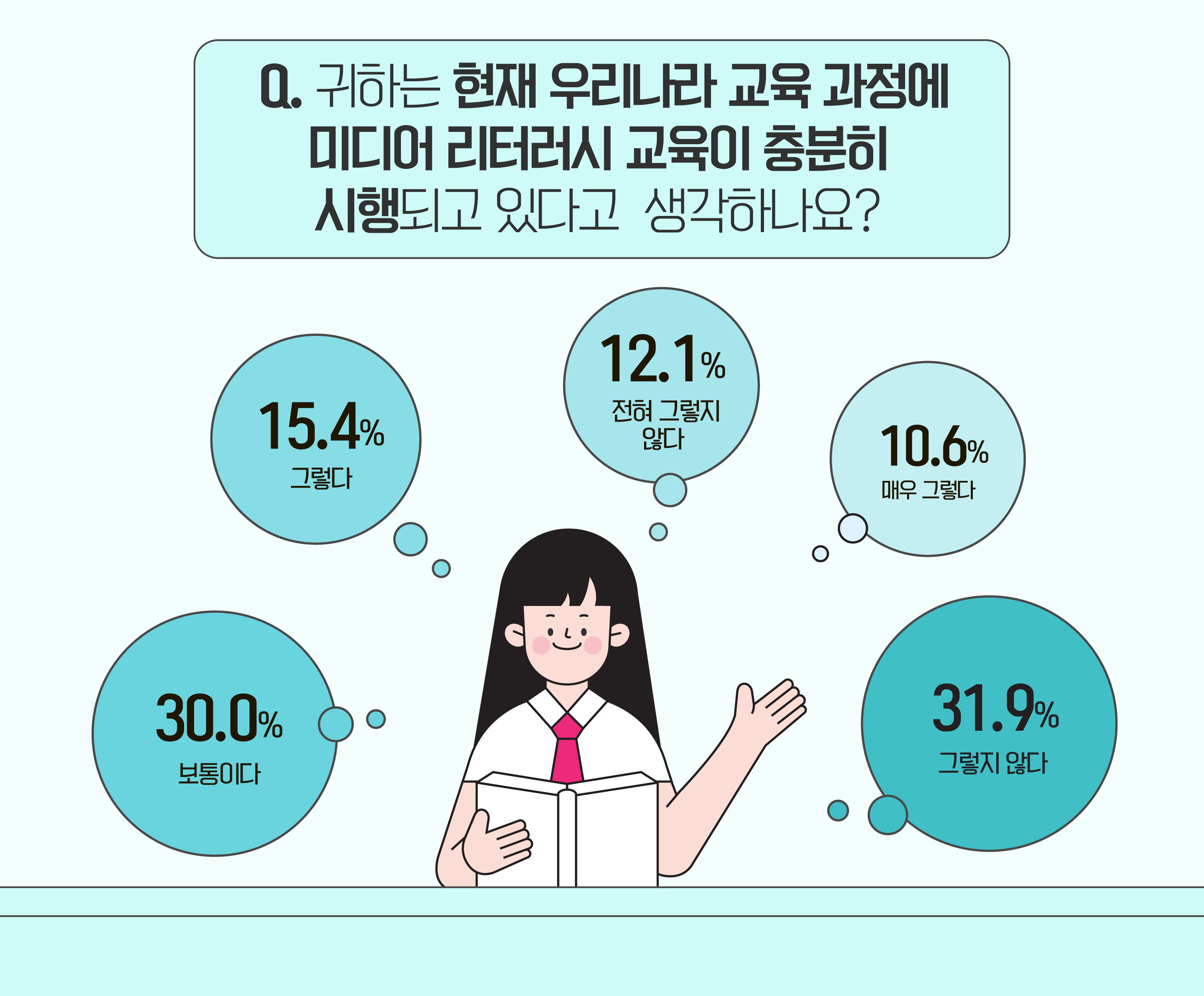 ‘전혀 그렇지 않다’는 의견은 12.1%였으며, ‘매우 그렇다’고 답한 사람은 10.6%로 집계됐습니다. 이 결과를 통해 대다수의 응답자들이 현재 미디어 리터러시 교육이 충분히 시행되고 있지 않다고 느끼고 있음을 확인할 수 있었습니다.