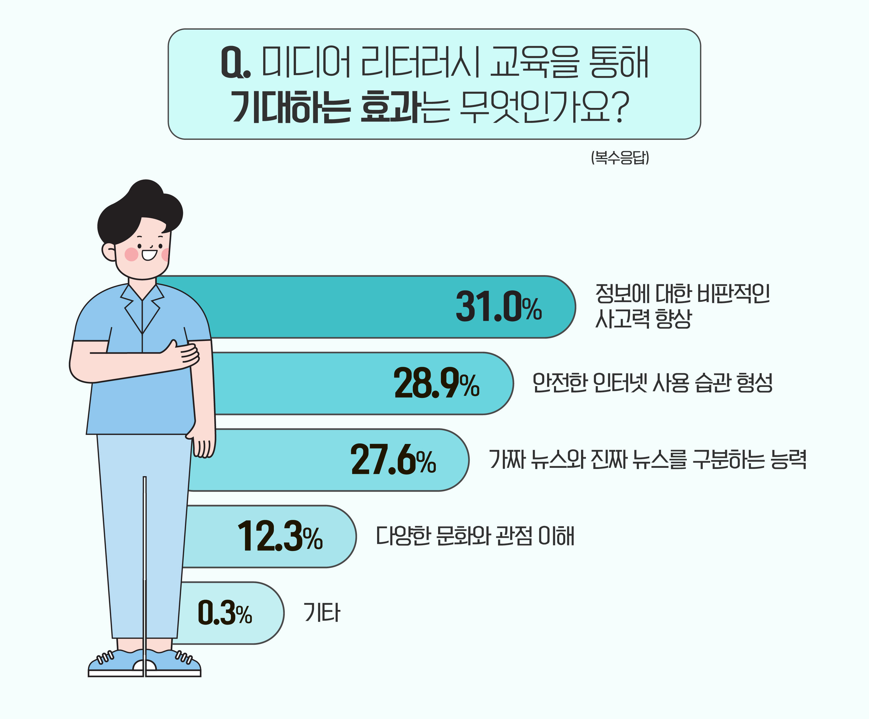 설문 응답자들이 미디어 리터러시 교육을 통해 기대하는 효과는 무엇일까요? 31%가 ‘정보에 대한 비판적인 사고력 향상’을 꼽았으며, ‘안전한 인터넷 사용 습관 형성’이 28.9%로 뒤를 이었습니다. ‘가짜 뉴스와 진짜 뉴스를 구분하는 능력’ 또한 27.6%로 근소한 차이를 보였네요! 뒤이어 ‘다양한 문화와 관점 이해’는 12.3%, ‘기타’는 0.3%로 집계됐습니다.