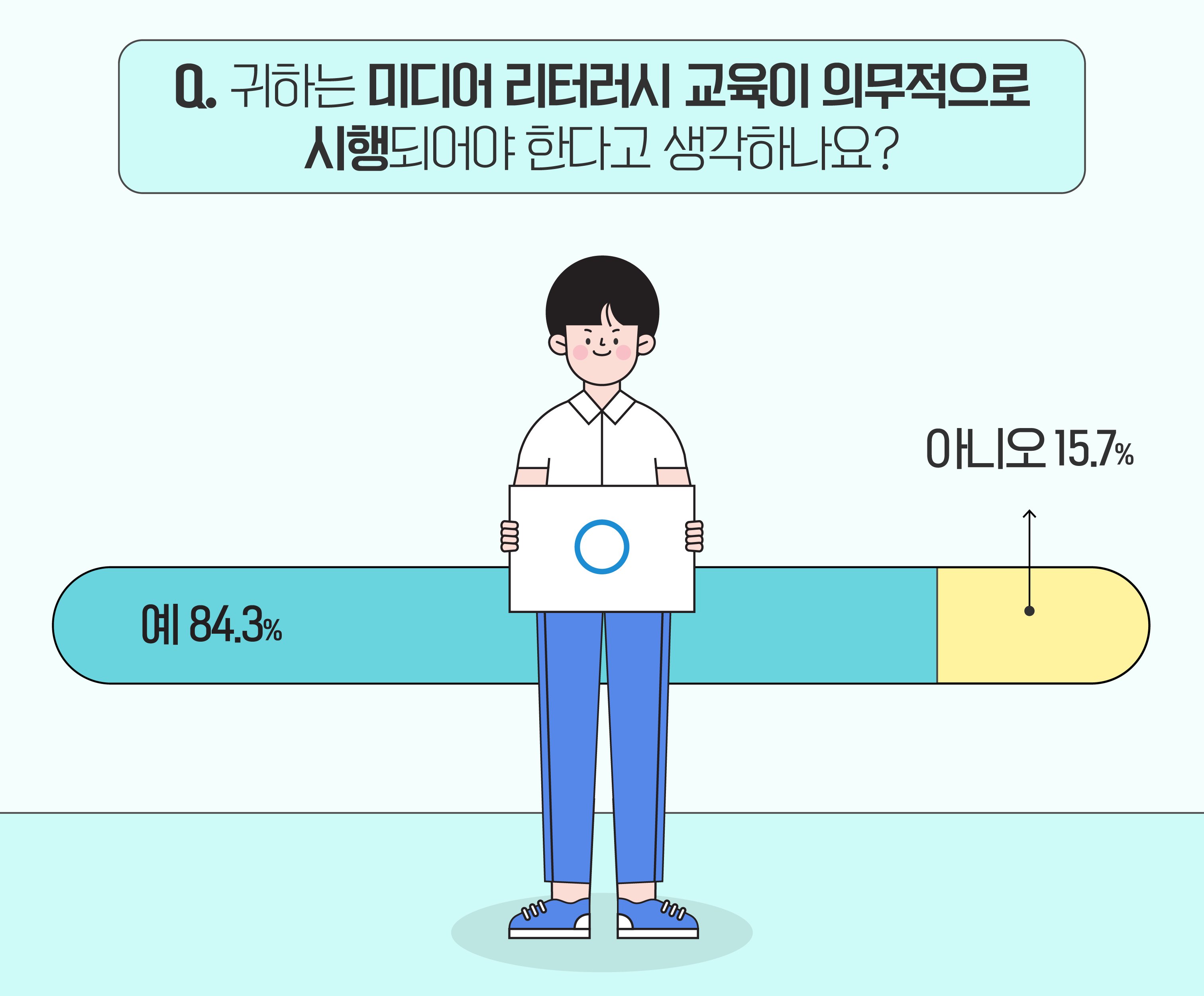그렇다면, 설문 응답자들은 미디어 리터러시 교육이 의무적으로 시행되어야 한다고 생각할까요? 설문 결과, 응답자의 84.3%가 긍정적인 반응을 보이며 미디어 리터러시 교육의 의무적 시행에 대해 찬성했습니다.
