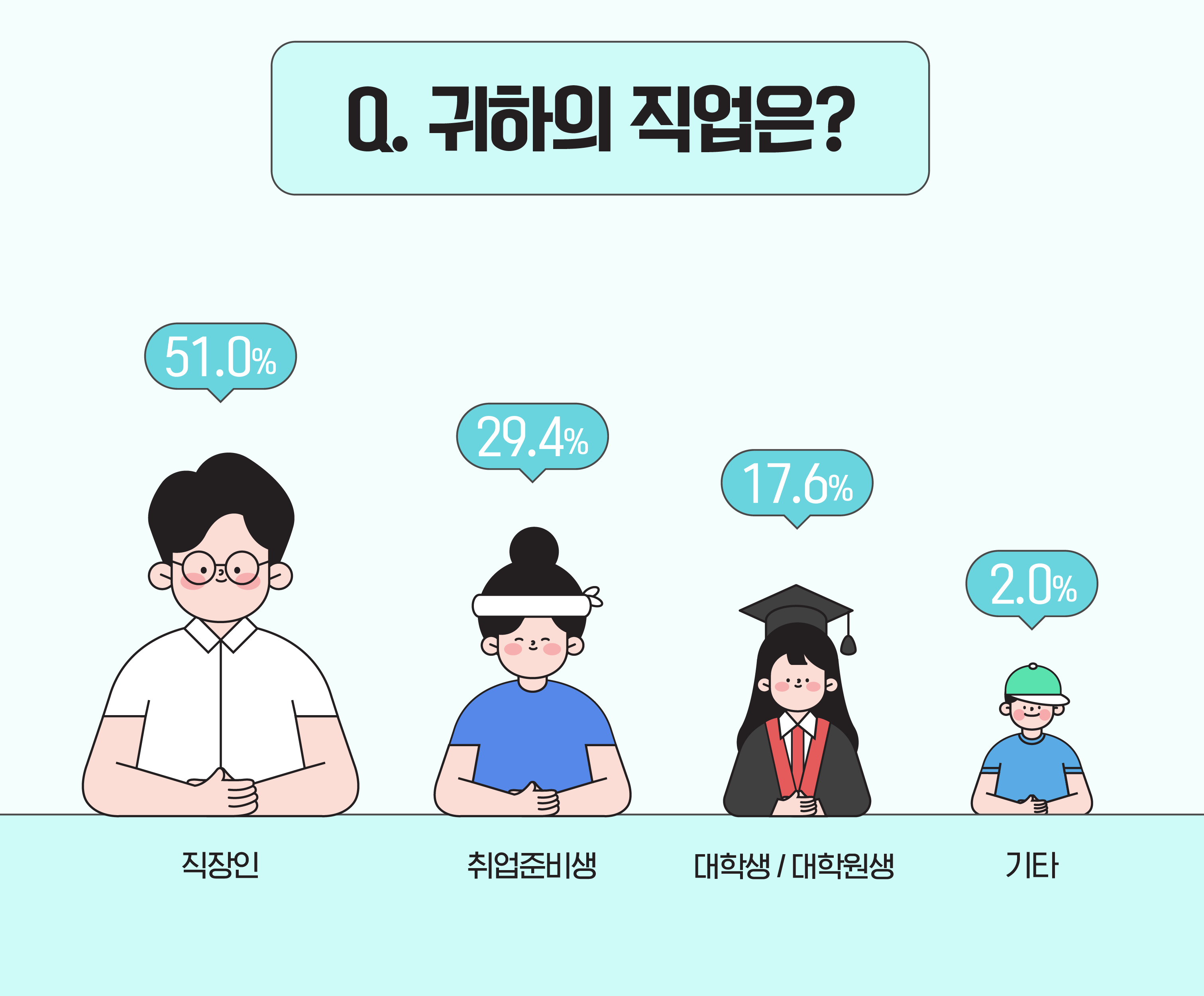 본격적인 설문에 들어가기 전, 설문 참여자들의 직업을 물었습니다. ‘직장인’이 51%로 가장 높은 비율을 차지했고, ‘취업준비생(29.4%)’, ‘대학생/대학원생(17.6%)’, ‘기타(2%)’ 순으로 나타났습니다.