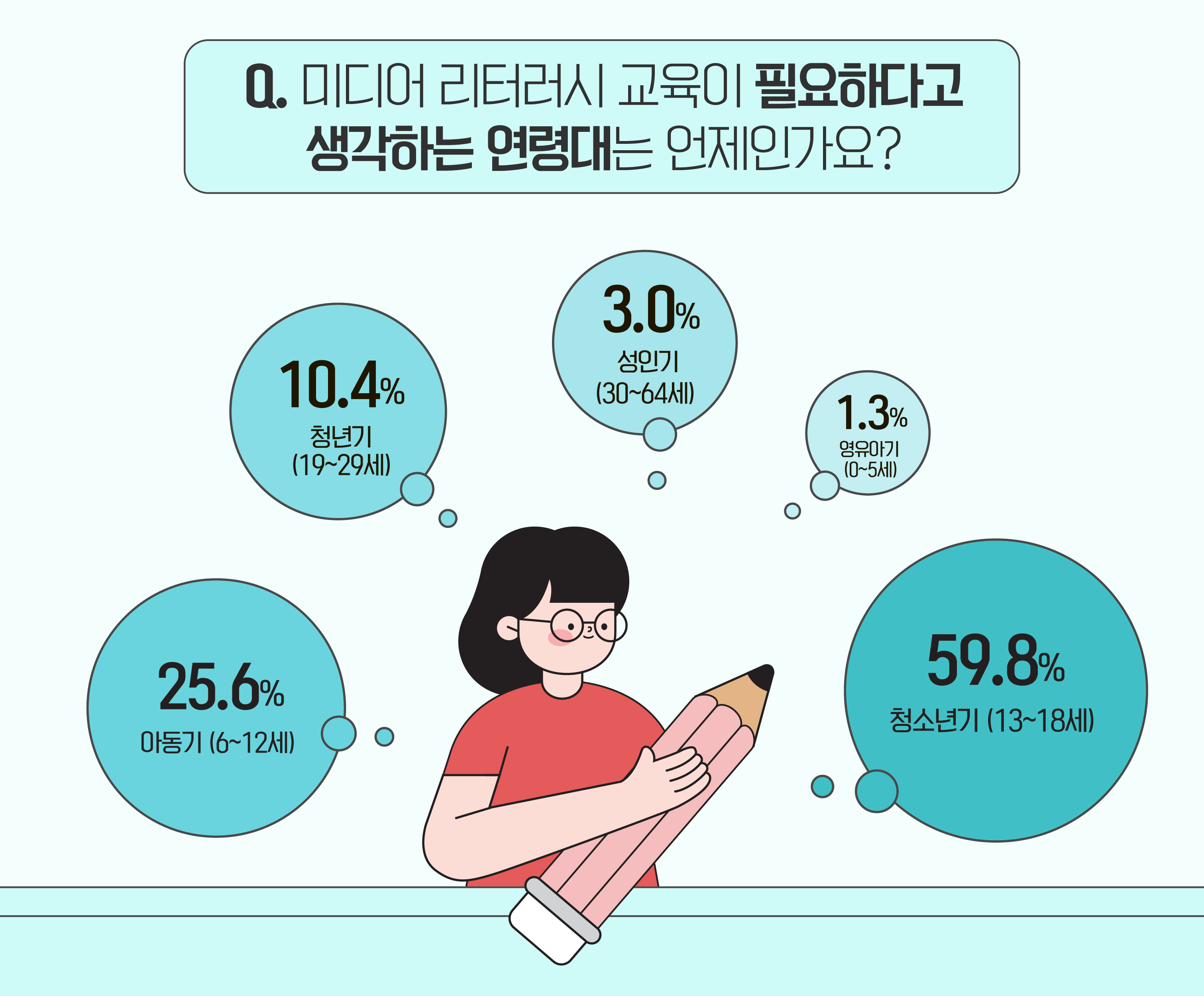 다음으로, 미디어 리터러시 교육이 필요한 연령대에 대해 물었는데요. 무려 응답자 59.8%가 ‘청소년기(13~18세)’에 미디어 리터러시 교육이 필요하다고 응답했습니다. 뒤이어 ‘아동기(6~12세)’를 꼽은 응답자가 25.6%, ‘청년기(19~29세)’가 10.4% 순으로 나타났습니다.
