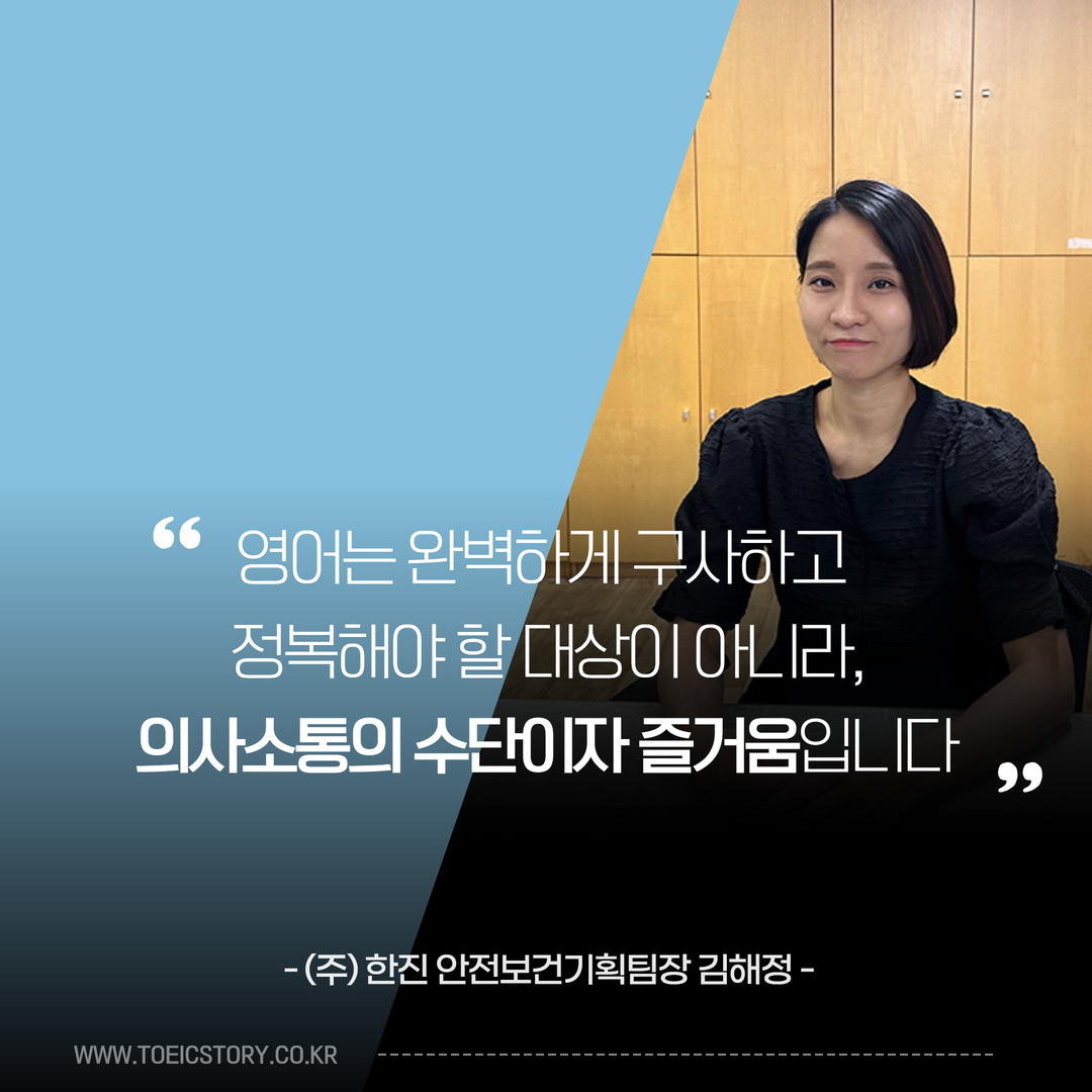 오늘 <토익스토리>는 (주)한진의 안전보건기획팀 김해정 팀장님을 만났습니다. 김 팀장님은 약 15년 전, 취업을 준비하실 때 토익과 함께하셨고 최근 진급을 위해 토익스피킹을 응시하셨는데요. 바쁜 업무 속에서도 토익스피킹 목표 성적을 달성하시며 영어에 대한 재미까지 느끼게 되셨다고 합니다. 대기업의 공인 영어 시험 활용 현황부터 영어에 대한 솔직한 이야기까지 바로 확인해 보세요!